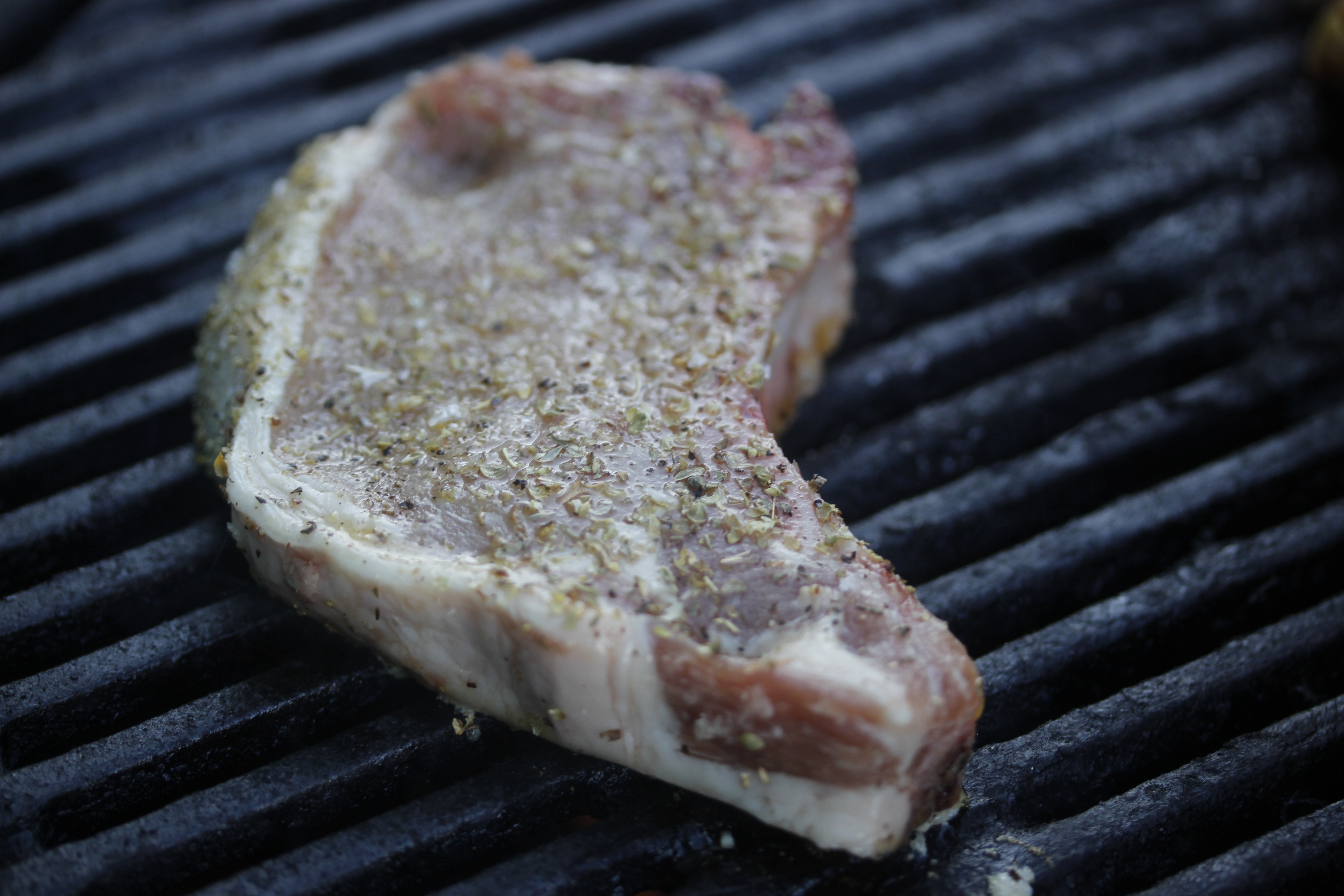 Það er eitthvað lítið um myndir af matreiðslunni, man ekki hvers vegna ég tók þær ekki … En ég byrjaði á að kveikja á grillinu. Svo tók ég fjórar grísakótelettur með beini, snyrta þær aðeins og þerra. Blandaði saman 2 msk af ólífuolíu, 1 msk af vínediki (má líka nota sítrónusafa), 1 tsk af þurrkuðu óreganói, pipar og salti, penslaði kóteletturnar með blöndunni og lét þær liggja á meðan ég undirbjó og grillaði grænmetið.