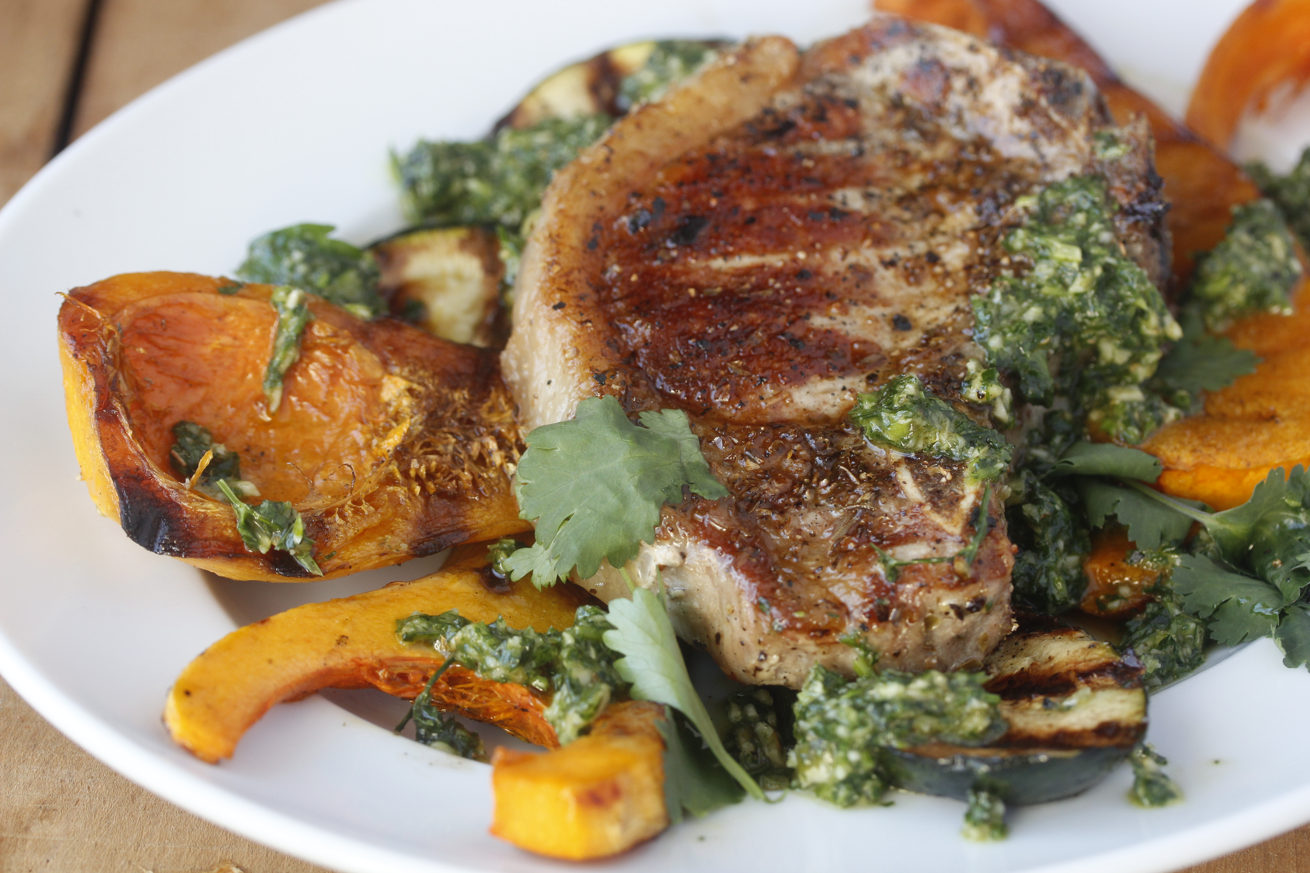 Ég grilla hins vegar mjög oft fisk nú orðið, eins og dæmi var umí gær, og ekki síður alls konar grænmeti. Það er nefnilega hægt að grilla flest grænmeti ef maður notar réttu aðferðirnar – ekki bara tómata, paprikur, sveppi, kúrbít og annað slíkt. Og hér er uppskrift sem inniheldur meðal annars grillað butternutgrasker, sem kannski ratar ekkert oft á grillið hjá fólki. Það þarf sinn tíma, vissulega, og það er betra að skera það ekki of þykkt. En það getur orðið mjög góður á grillinu. Svo grillaði ég líka kúrbít og bar þetta fram með grísakótelettum, ásamt kryddjurtamauki.