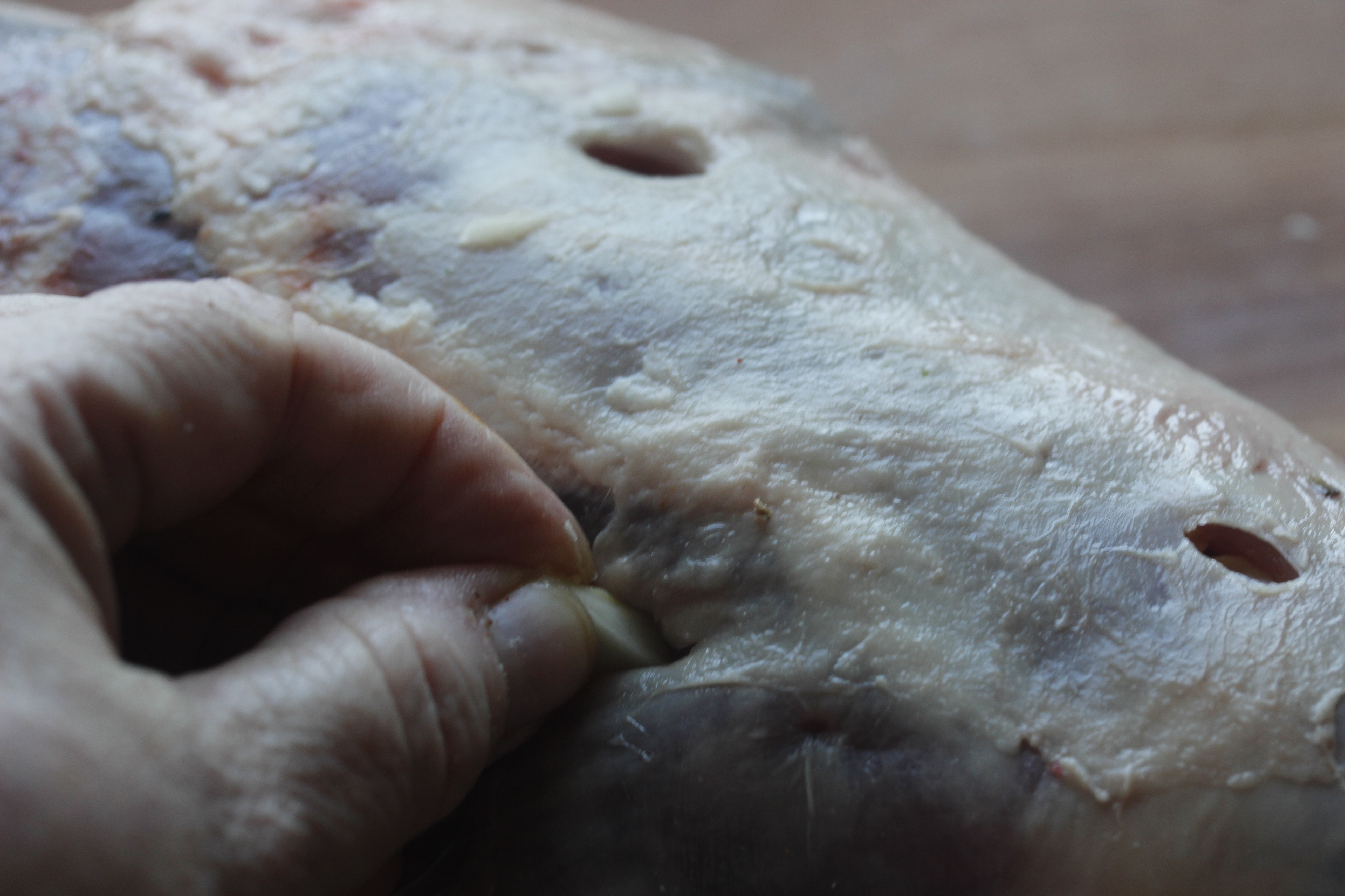 Það er til dæmis hægt að krydda það með ýmsum kryddjurtum og kryddi, svo sem rósmaríni eins og ég gerði hér, og það er líka hægt að stinga raufar í það og setja til dæmis hráskinkusneið og hvítlauksflís í hverja rauf, eins og ég gerði hér: