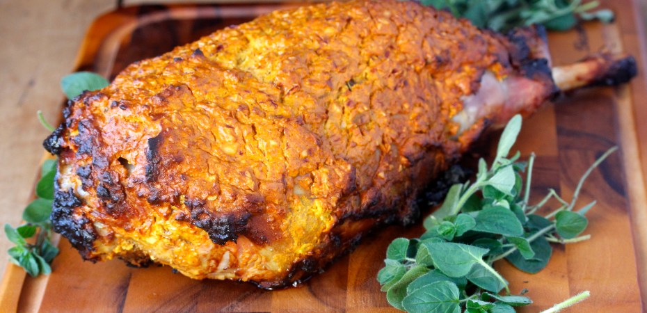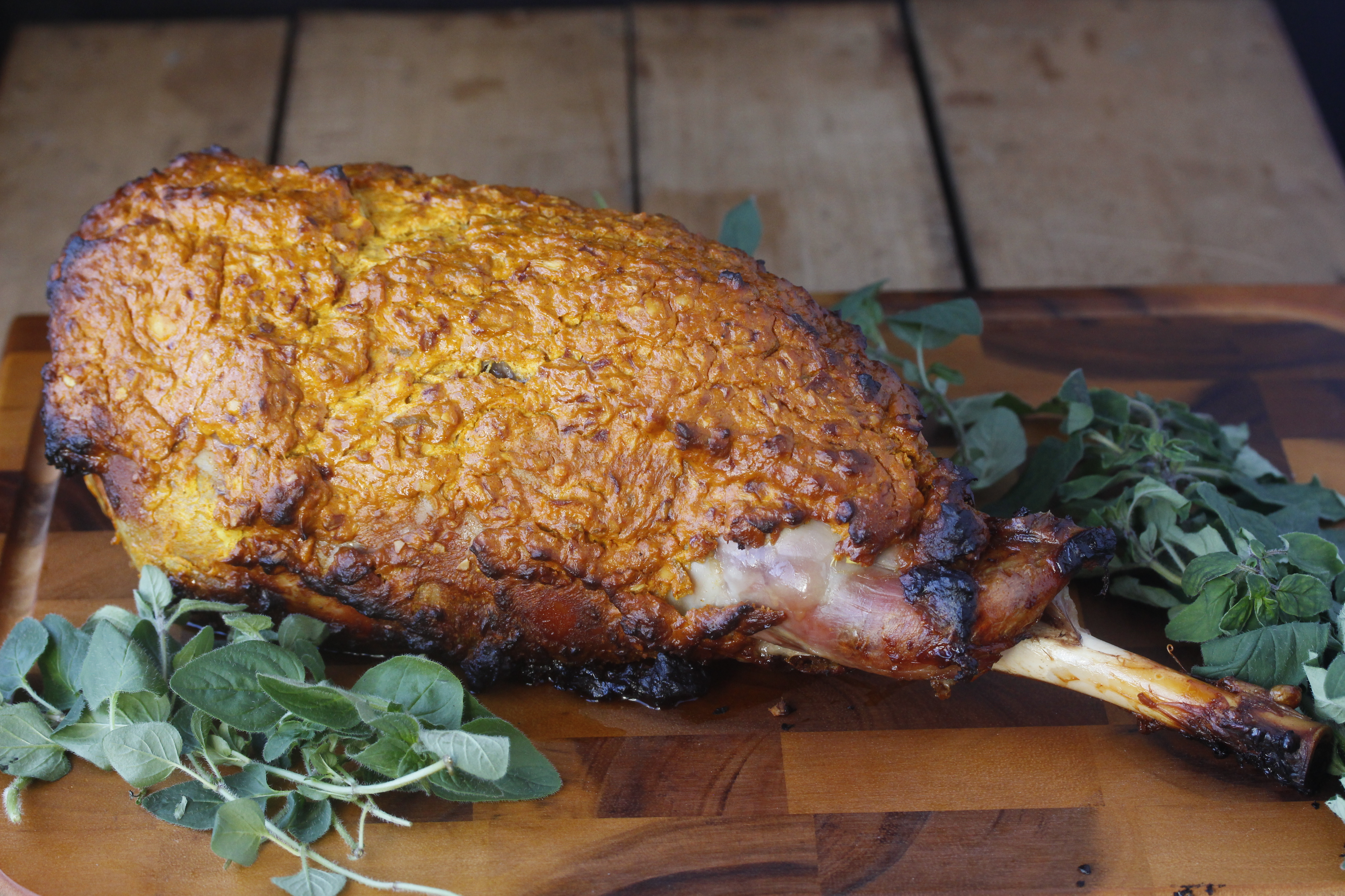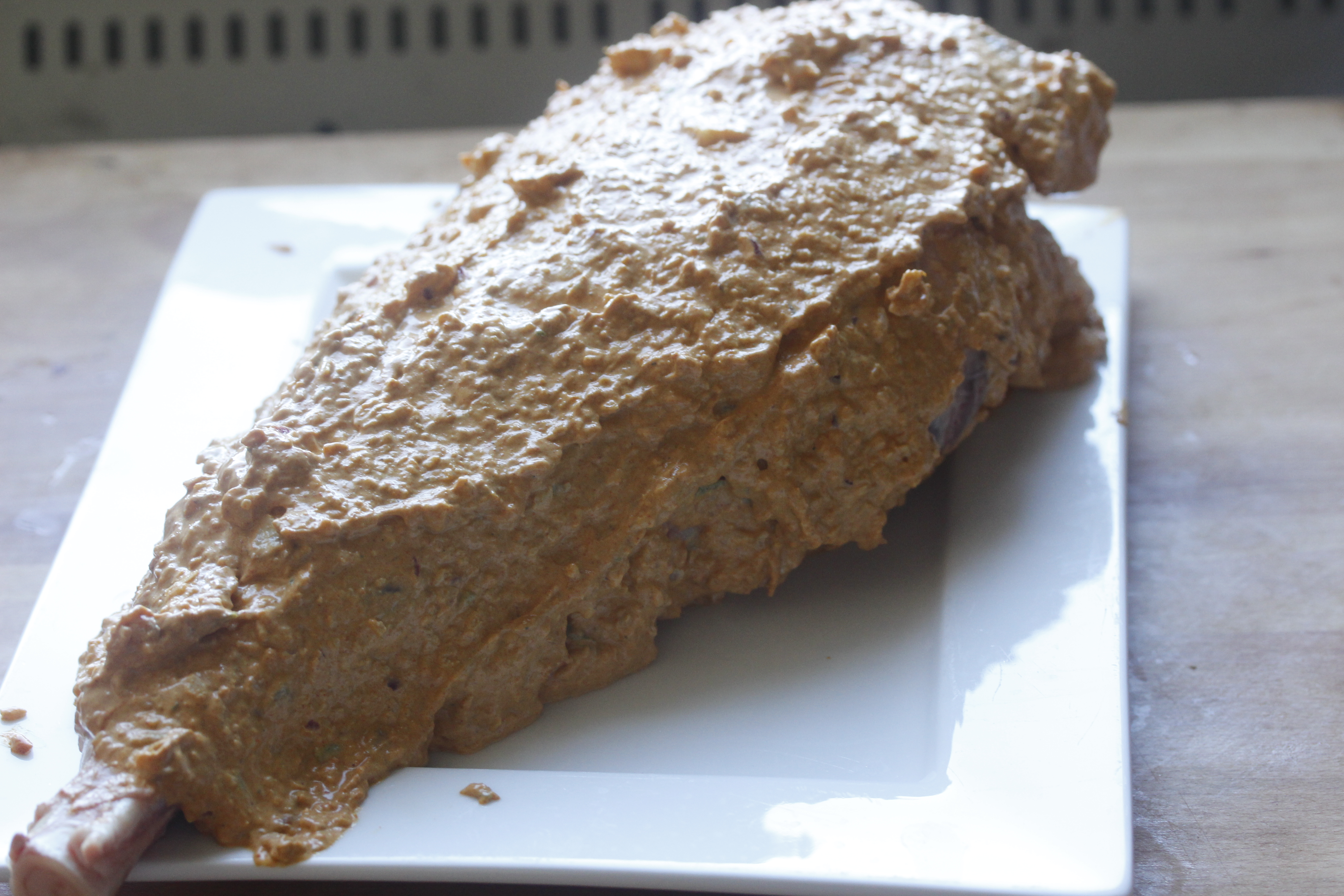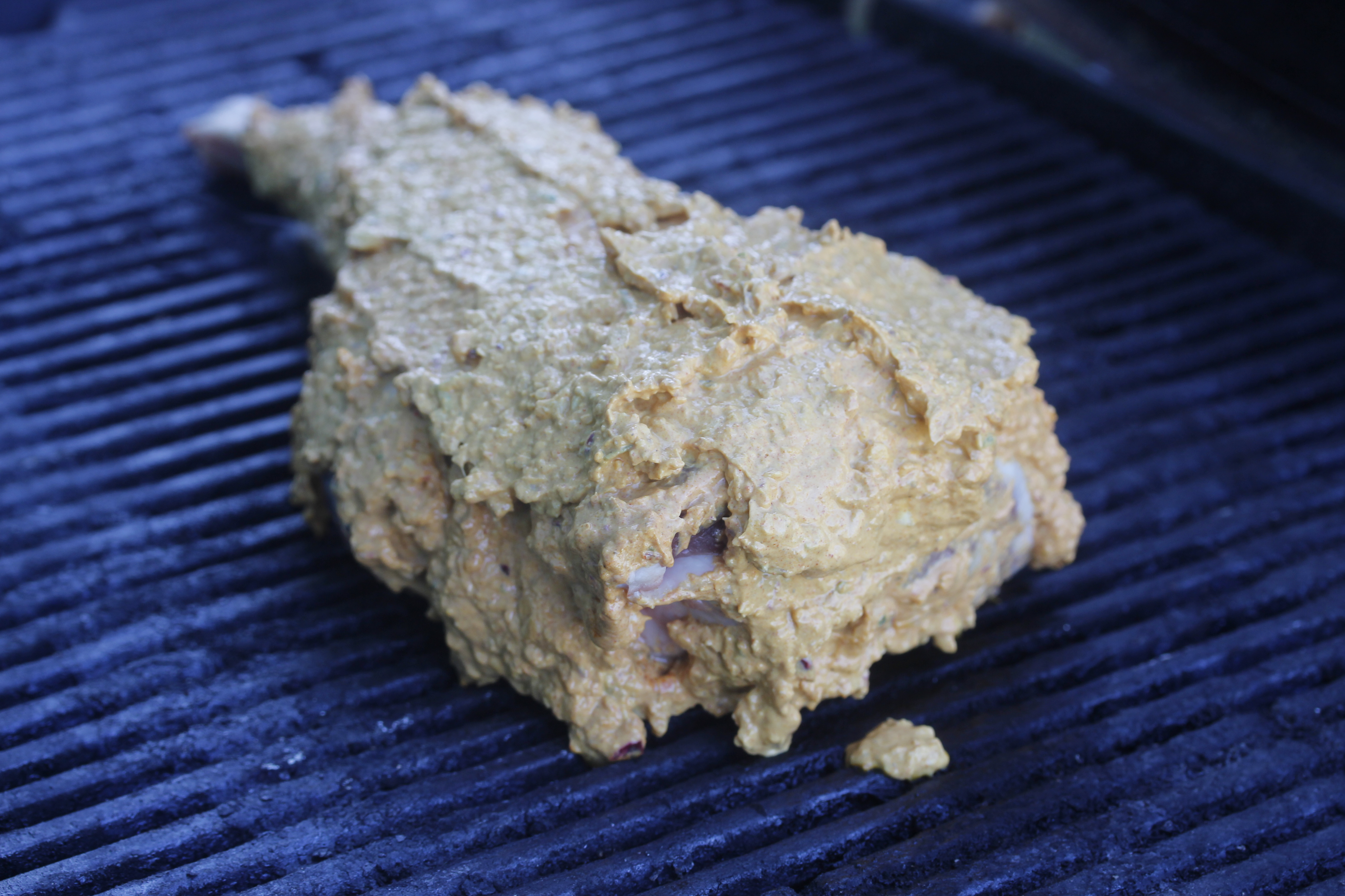 Svo er hægt að smyrja ýmiss konar kryddmauki, grillsósu eða öðru slíku á lærið, eða þá sinnepi. Og svo má marínera það og grilla í þykkum hjúpi og þannig er uppskriftin sem kemur hér á eftir. Hér er önnur útgáfa sem ég hef áður verið með, en þessa nýju gerði ég fyrir grillþátt í MAN í vor.