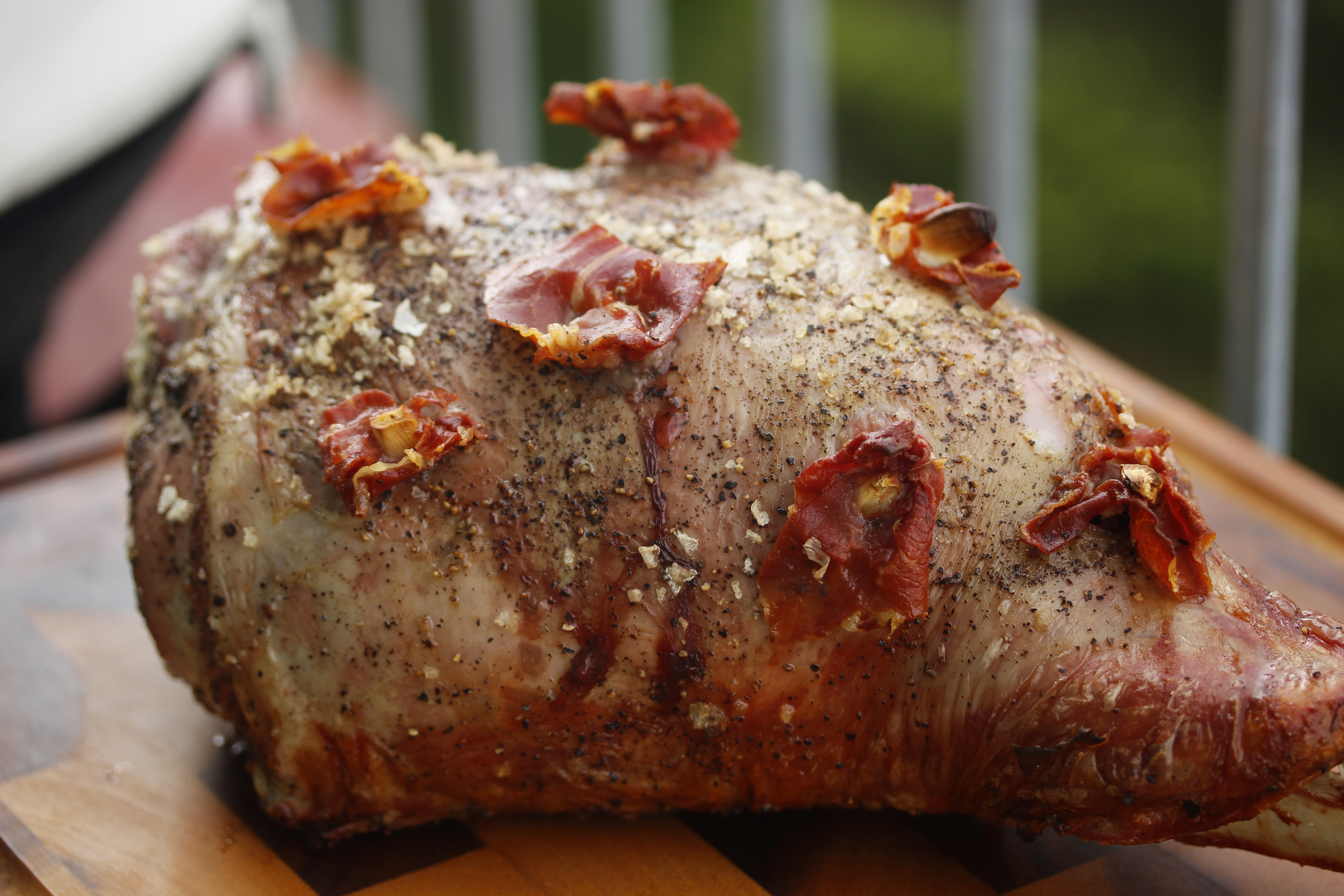 Daginn eftir, þegar að því kom að grilla lærið, tók ég það úr kæli og lét það standa í svona klukkutíma við stofuhita. Svo hitaði ég grillið og hafði það lokað. Þegar það var orðið vel heitt slökkti ég á miðjubrennaranum (eða öðrum ef þeir eru tveir – ef maður er með gasgrill má hafa álbakka í miðjunni til að búa til svæði þar sem enginn eldur er.