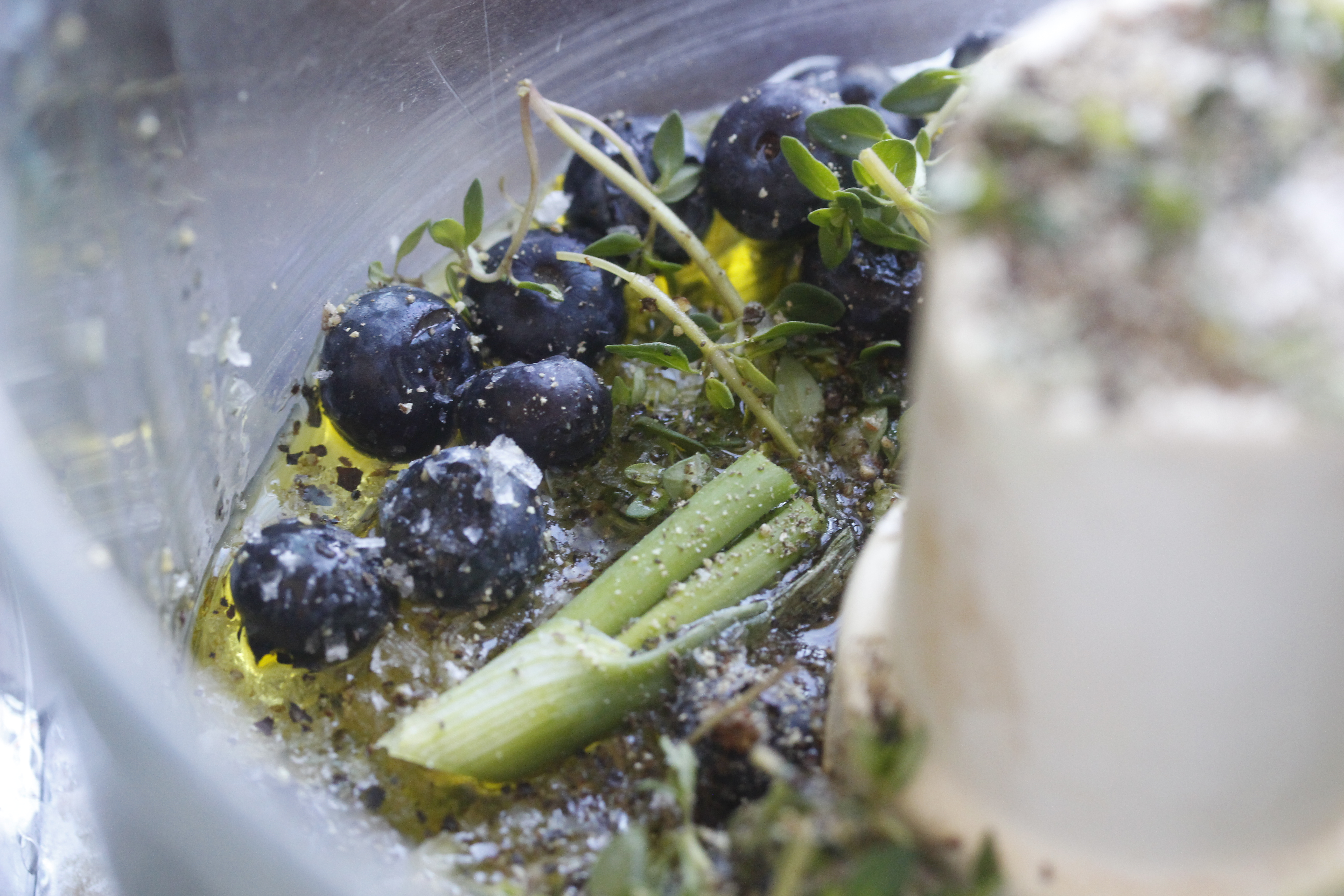 Svo gerði ég maríneringuna: setti 100 g af bláberjum (ég var með ný en þau mega alveg vera frosin), blöð af nokkrum timjangreinum, 2 vorlauka, 1 hvítlauksgeira, 3 msk af ólífuolíu, 2 msk af balsamediki, pipar og salt í matvinnsluvélina og maukaði saman.
