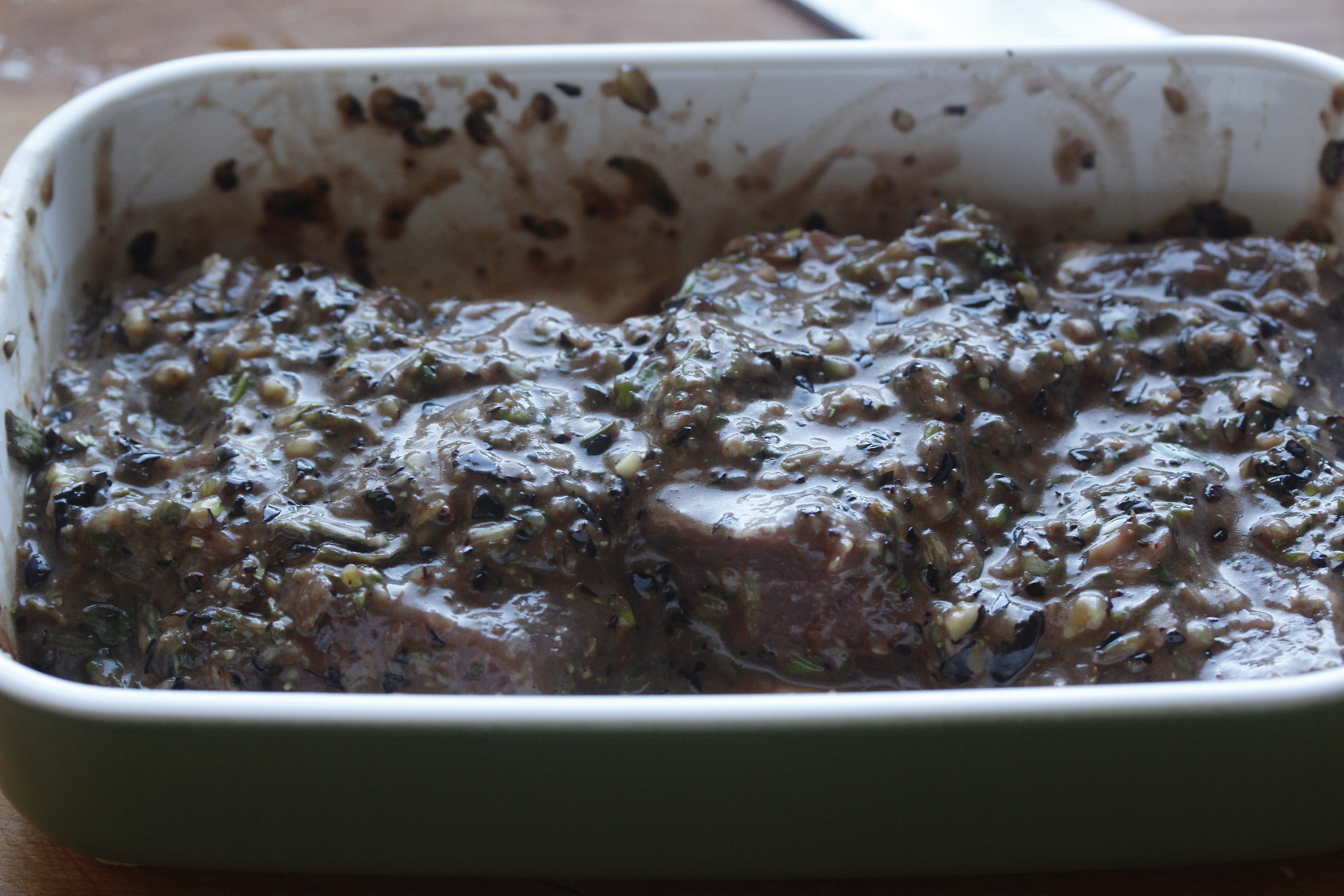 Ég smurði svo maukinu á kjötið og lét það standa í a.m.k. 1 klst. Bara á eldhúsbekknum en ef það stendur lengur en klukkutíma er best að hafa það í kæli.