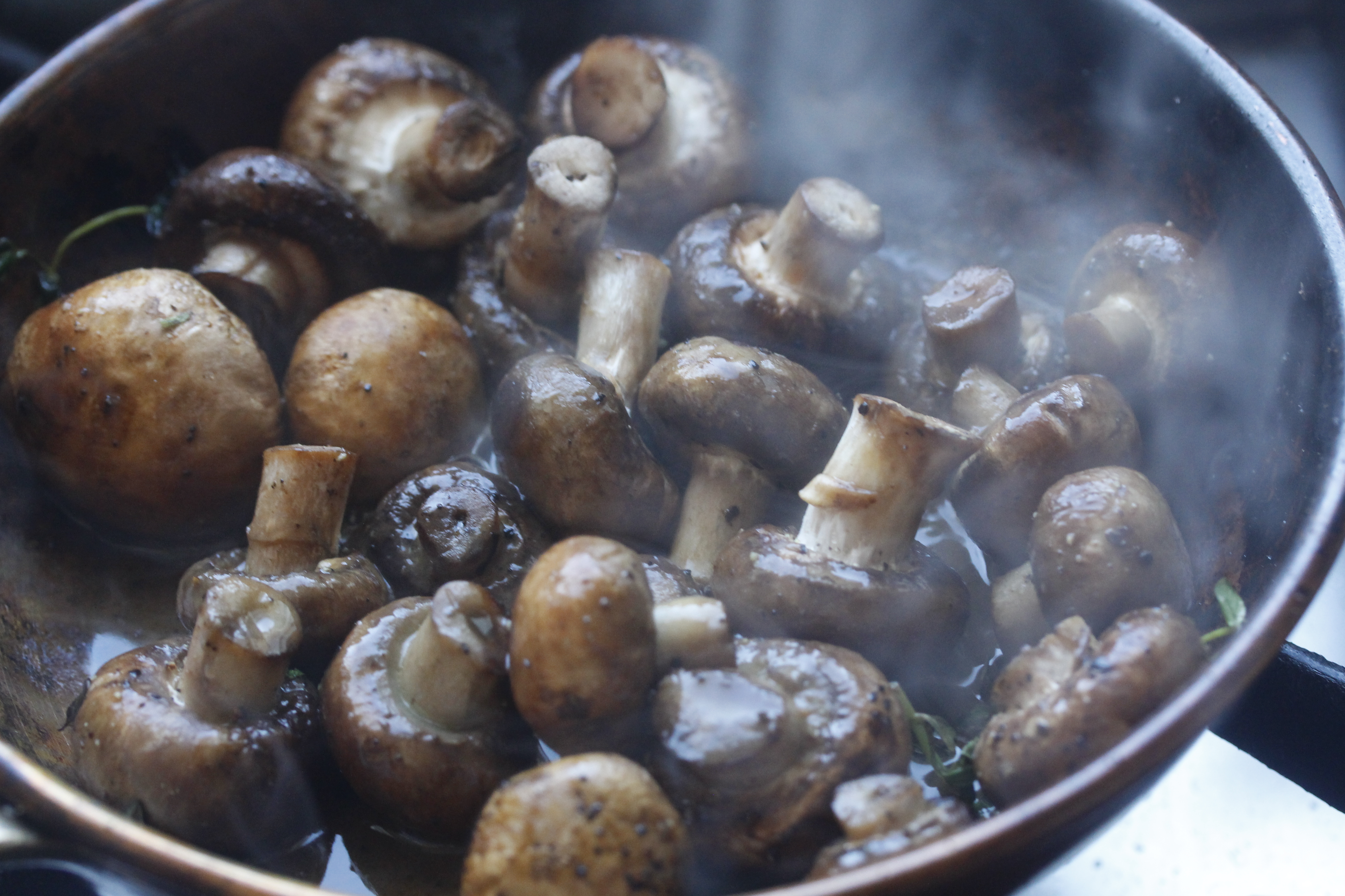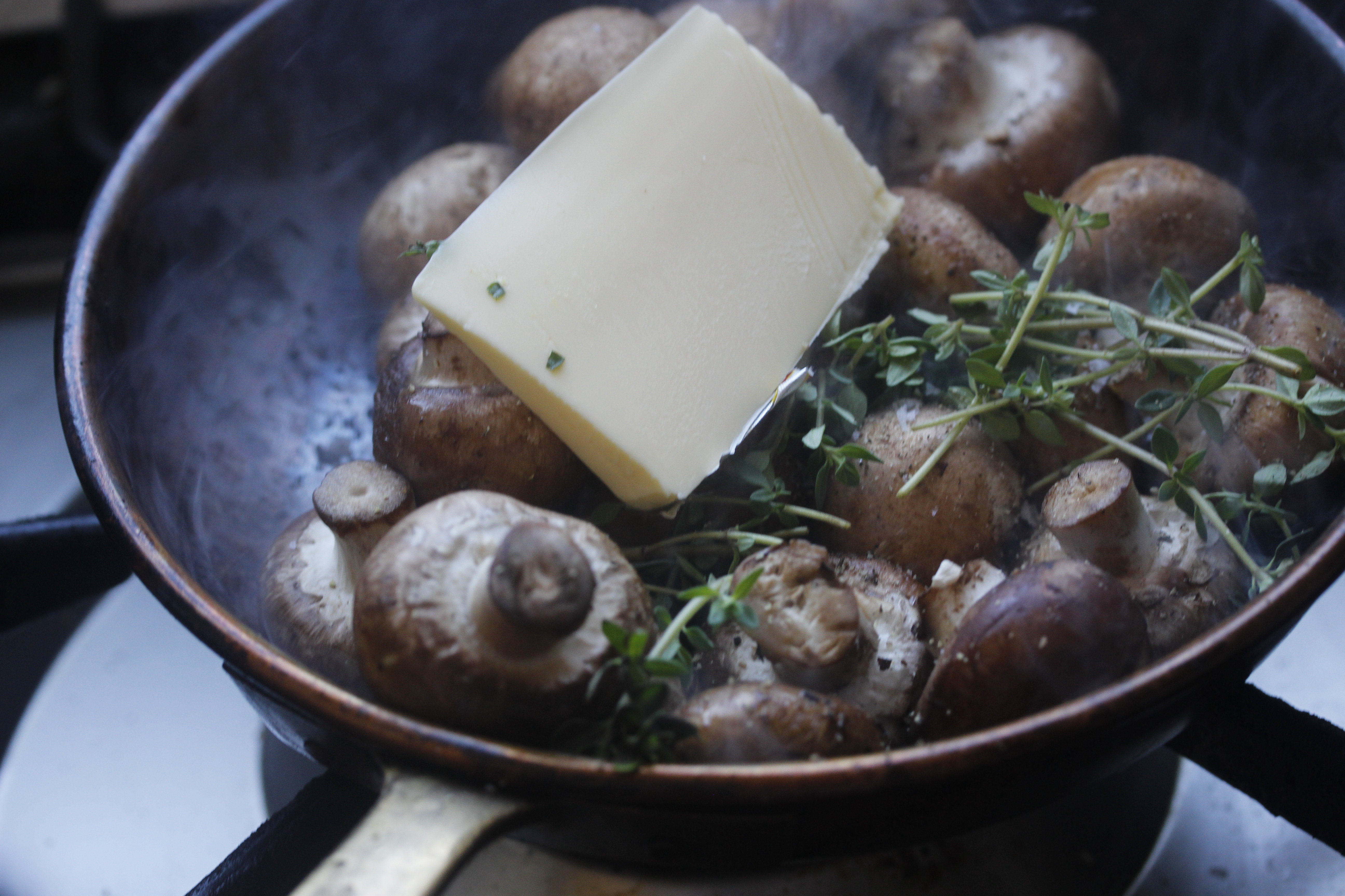 Á meðan kjötið grillaðist á svölunum stóð ég við eldavélina rétt innan við eldhúsgluggann og steikti sveppi til að hafa með. Tók 400 g af kastaníusveppum (það má nota venjulega), skolaði þá og þerraði – hefði e.t.v. skorið þá í tvennt eða fernt ef þeir hefðu verið mjög stórir en það voru þeir ekki – hitaði 1 msk af olíu á pönnu og setti sveppina á hana ásamt 2-3 timjangreinum og svona 30 g af smjöri. (Þið sjáið ekkert smjörumbúðirnar sem óvart fóru með á pönnuna, er það nokkuð? Ég sá þær – en ekki fyrr en ég var búin að taka mýndina.)