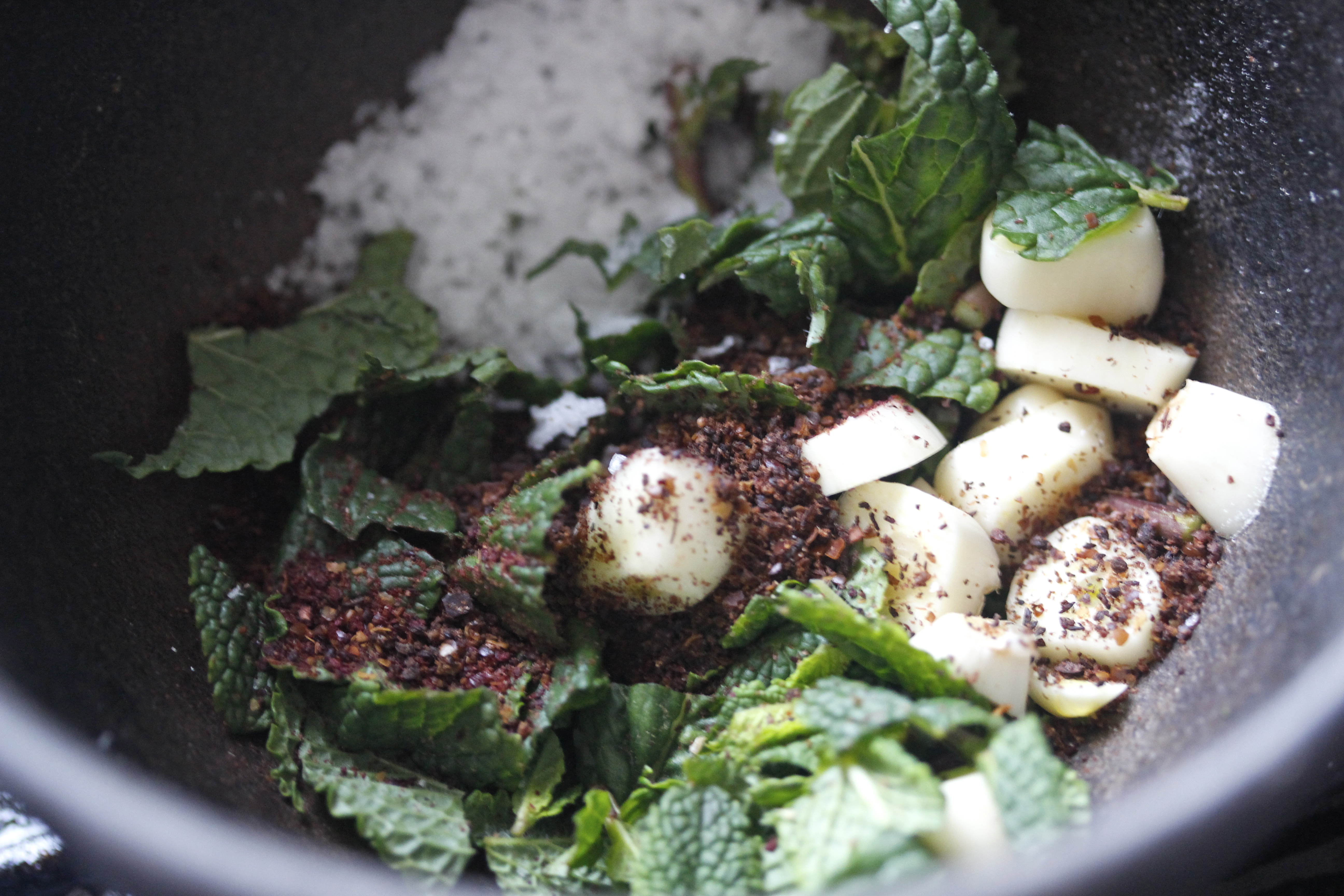 Svo tók ég þrjá hvítlauksgeira, grófsaxaði þá og setti í mortél ásamt 3-4 msk af saxaðri mintu, rifnum berki af 1/2 sítrónu og 1 tsk af súmaki. Ef súmak fæst ekki má sleppa því en krydda e.t.v. í staðinn með ögn af kummini og kóríander. Já, og svo setti ég pipar og salt. Ég steytti þetta vel saman í mortélinu (það má líka nota matvinnsluvél) og hrærði svo 3 msk af ólífuolíu saman við.