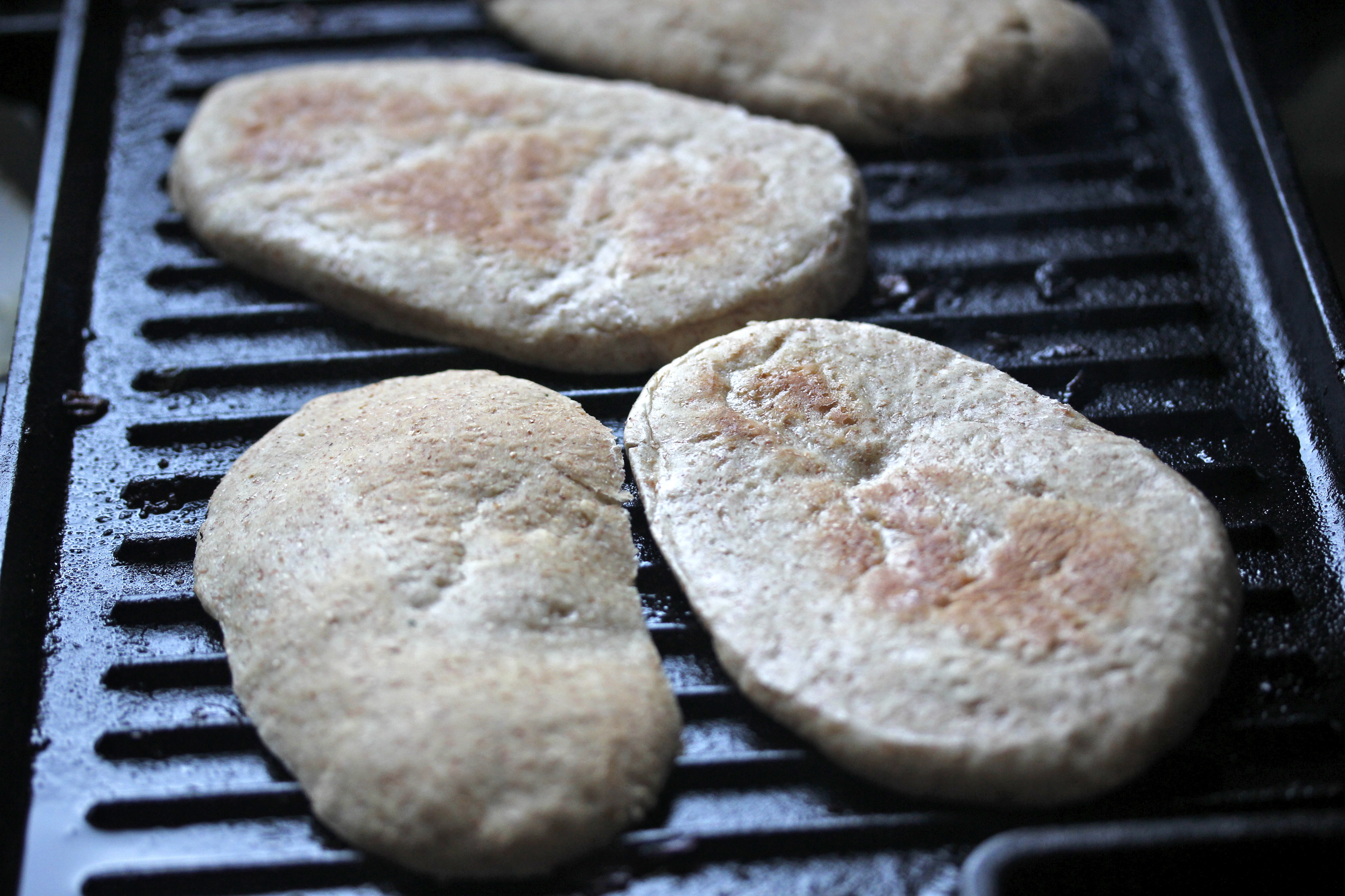 Þegar grillpannan var orðin heit tók ég tvö pítubrauð (heilhveiti, en mega vera hvít) og skar þau í sundur. Ristaði þau svo á pönnunni (eða á útigrilli eða í ofni) þar til þau voru hálfþurr og stökk og byrjuð að taka lit. Tók þau svo af pönnunni og lét þau kólna aðeins.