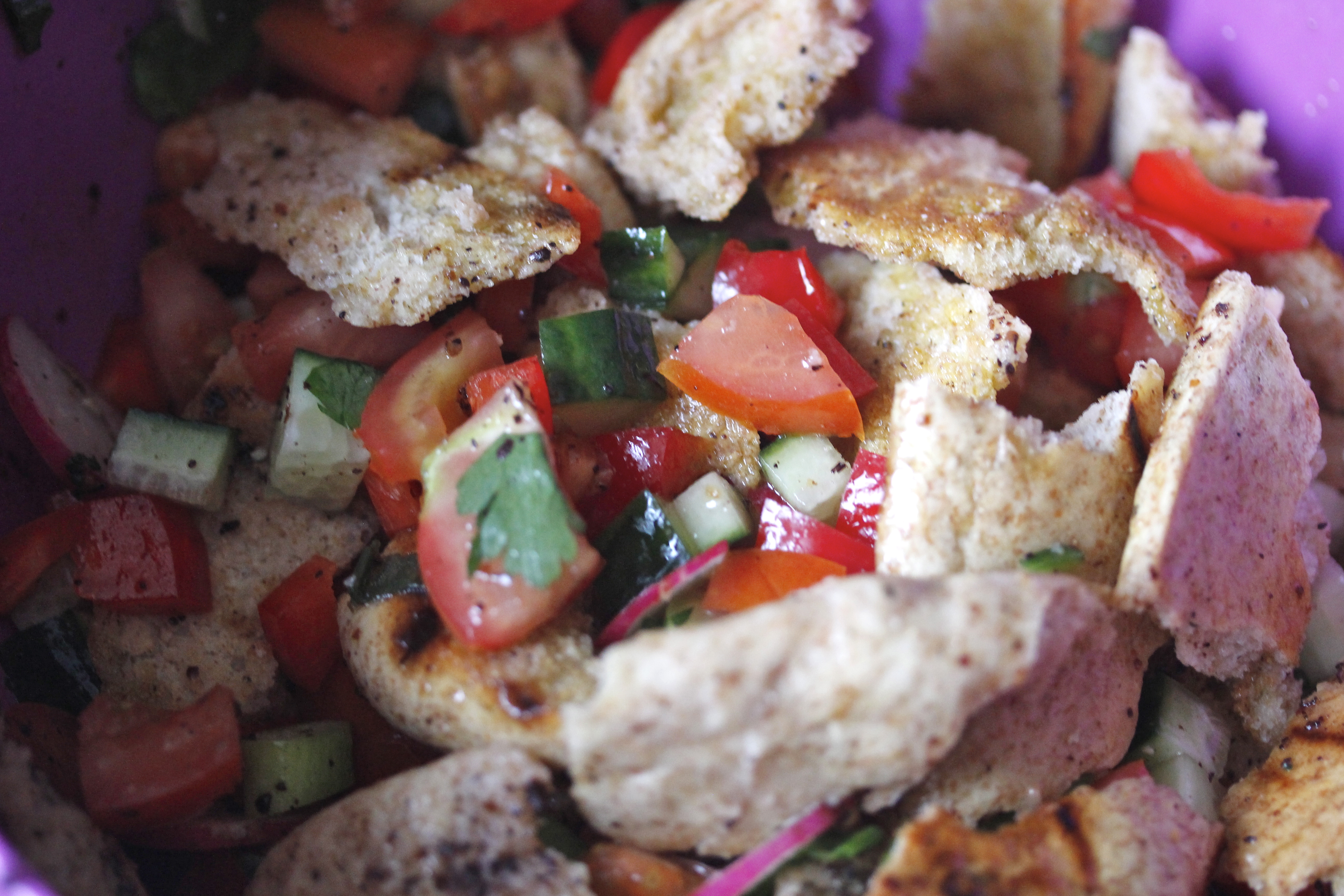Svo blandaði ég öllu grænmetinu saman við, ásamt lófafylli af salatblöðum. Svo hrærði ég saman 25 ml (tæpum 2 msk) af ólífuolíu, safa úr 1 sítrónu, 1/2 pressuðum hvítlauksgeira, 1 msk af súmaki (eða rifnum berki af 1 sítrónu, pipar og salti, hellti yfir salatið og blandaði vel.