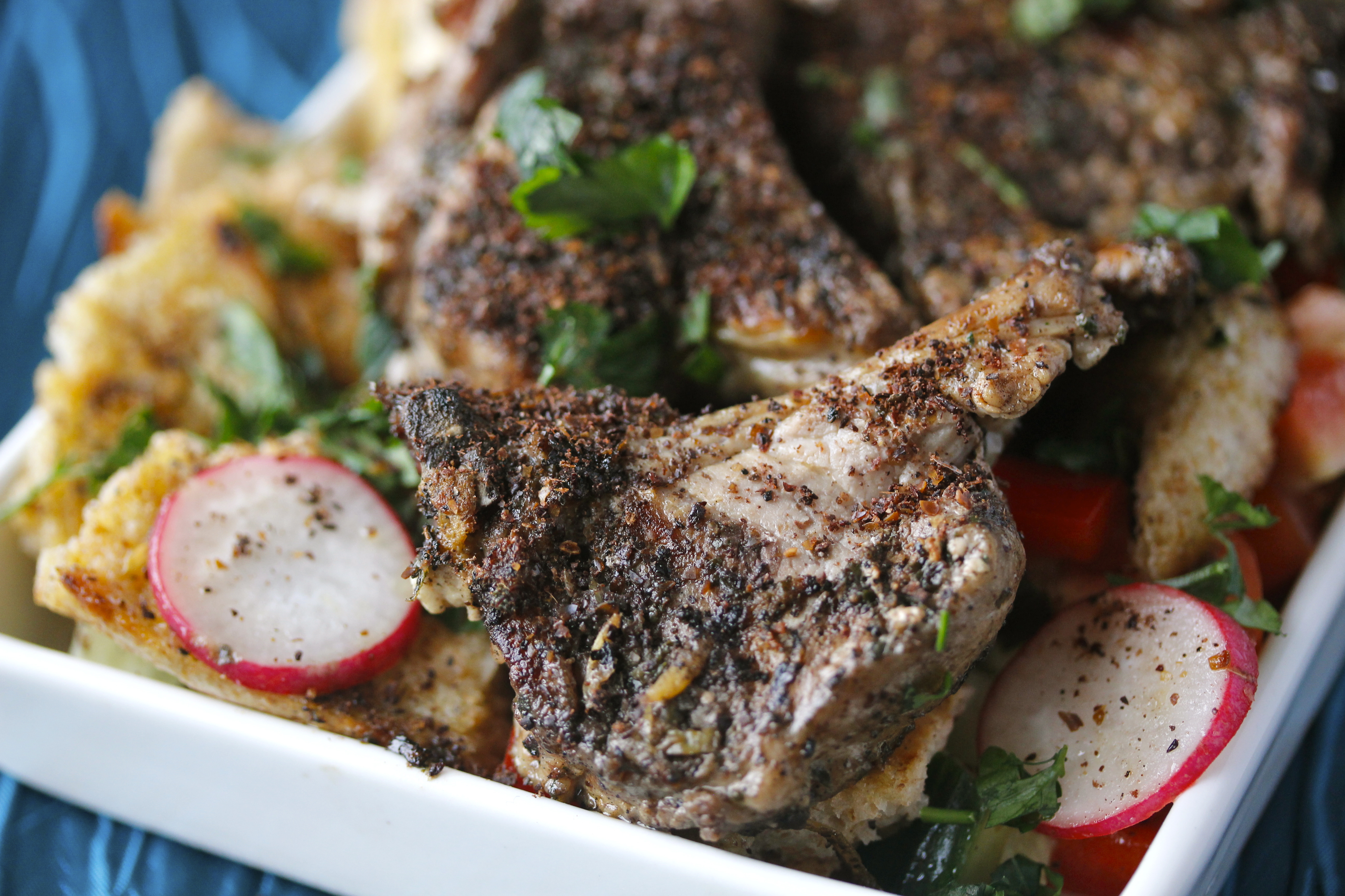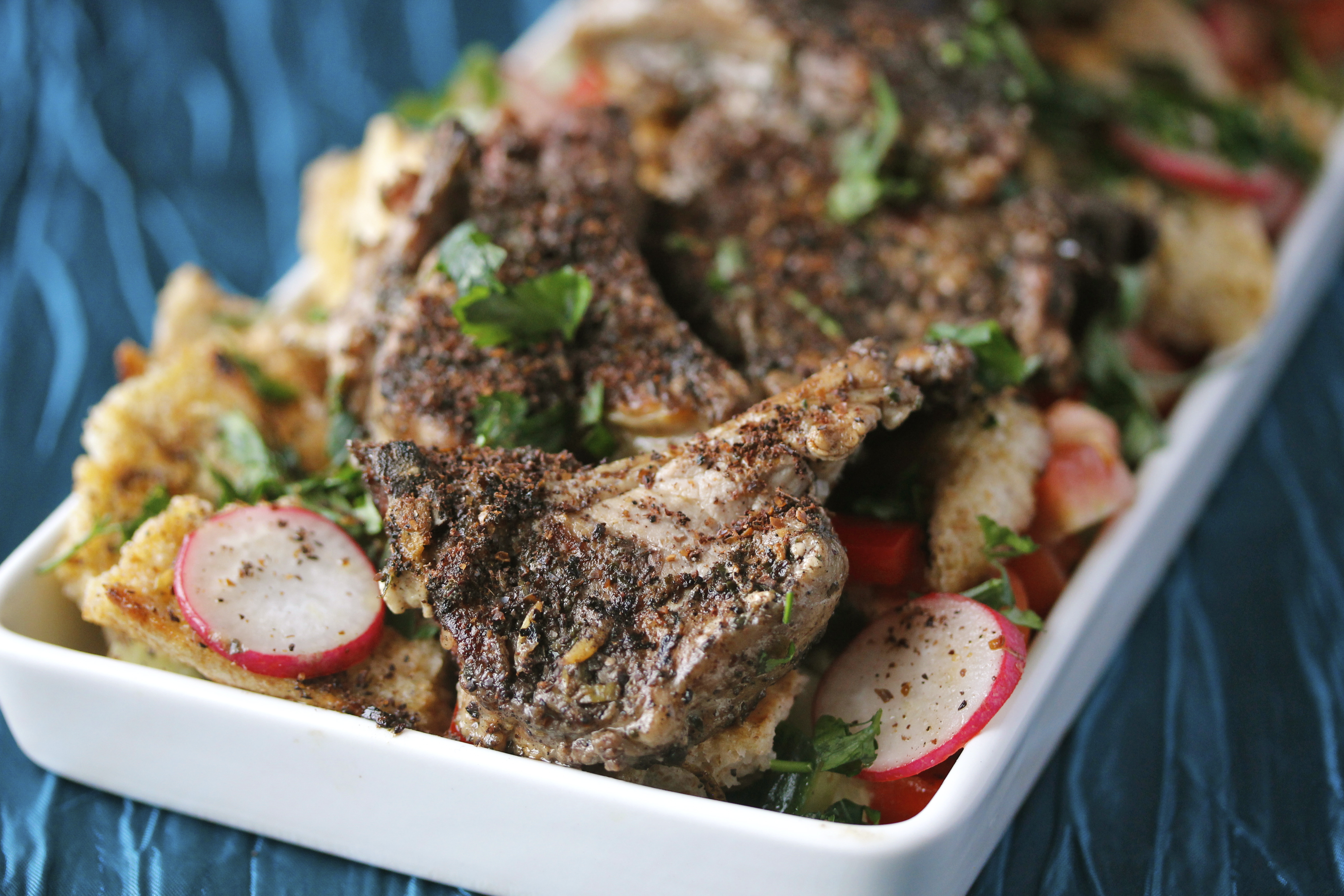 Bæði kóteletturnar og salatið eru krydduð með súmaki (sumac), en það er krydd sem er vinsælt í Mið-Austurlöndum og fæst stundum hér. Í rauninni er ekkert sem kemur í staðinn fyrir það en það er allt í lagi að sleppa því og nota kannski heldur meiri sítrónubörk í staðinn, því súmak hefur sýrukeim.