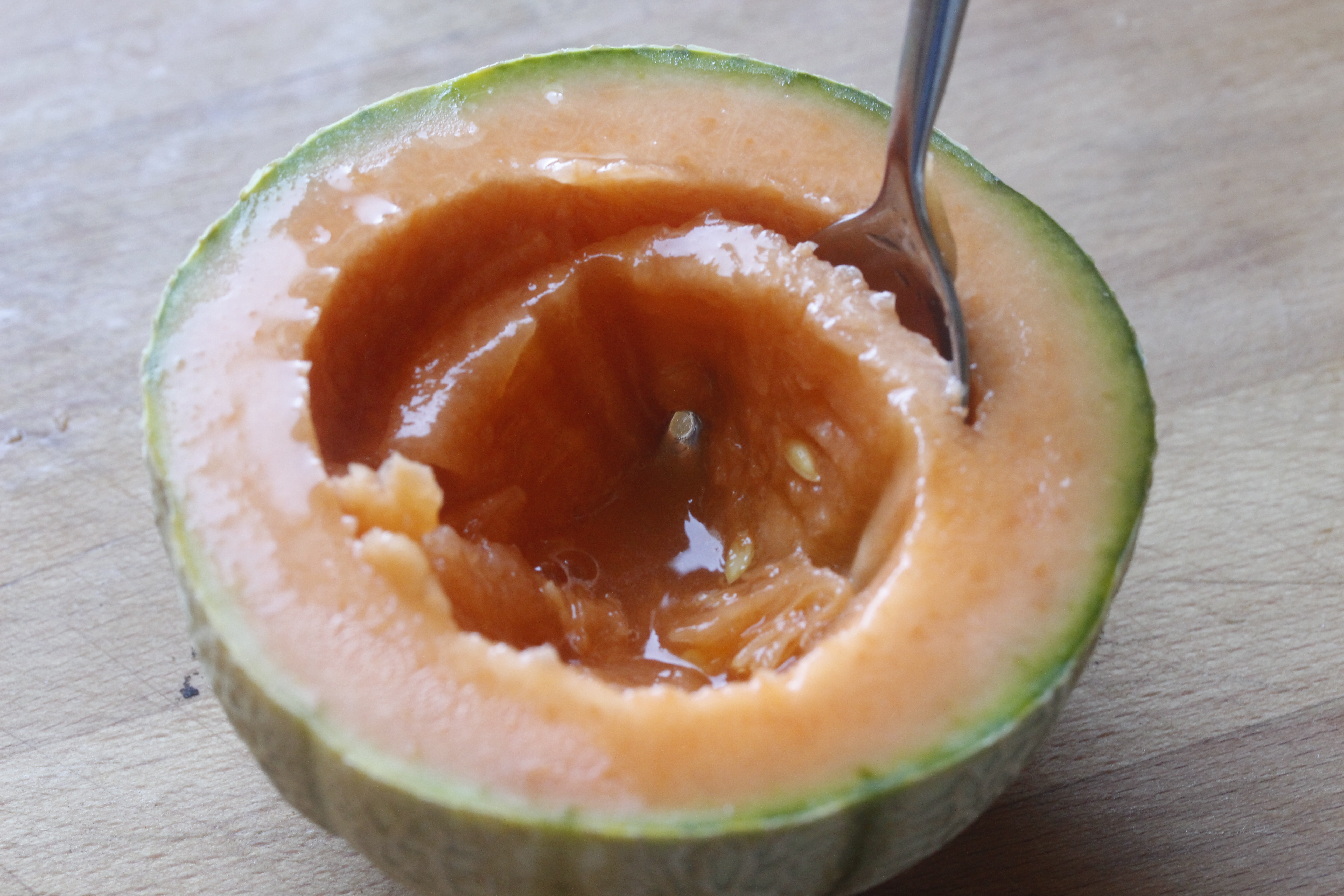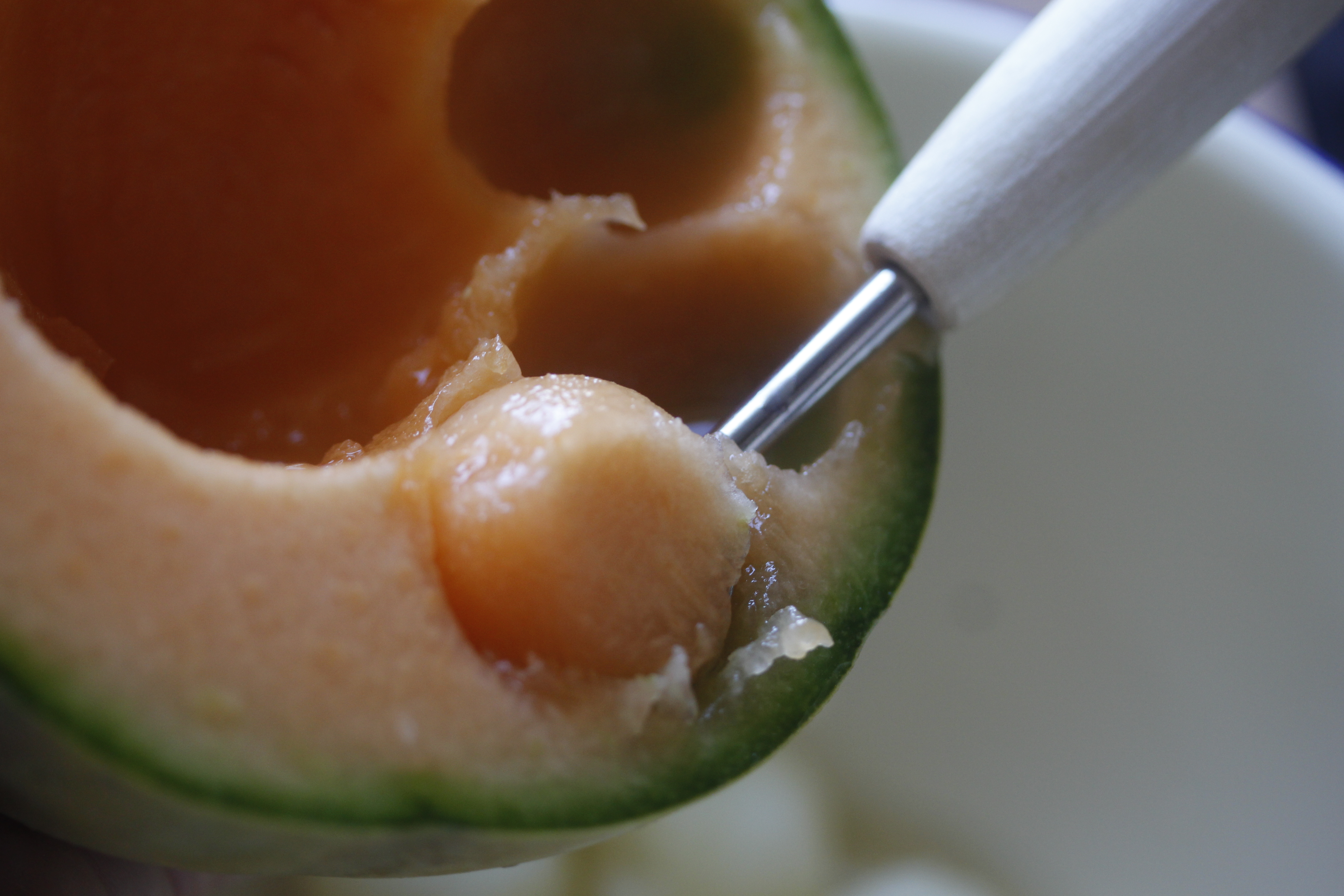 Ég skóf svo fræin og dálítið af aldinkjötinu úr kantalópuhelmingunum með skeið til að gera skálar. Skar reyndar líka örþunna sneið neðan af hvorum melónuhelmingi svo að skálarnar væru stöðugar.