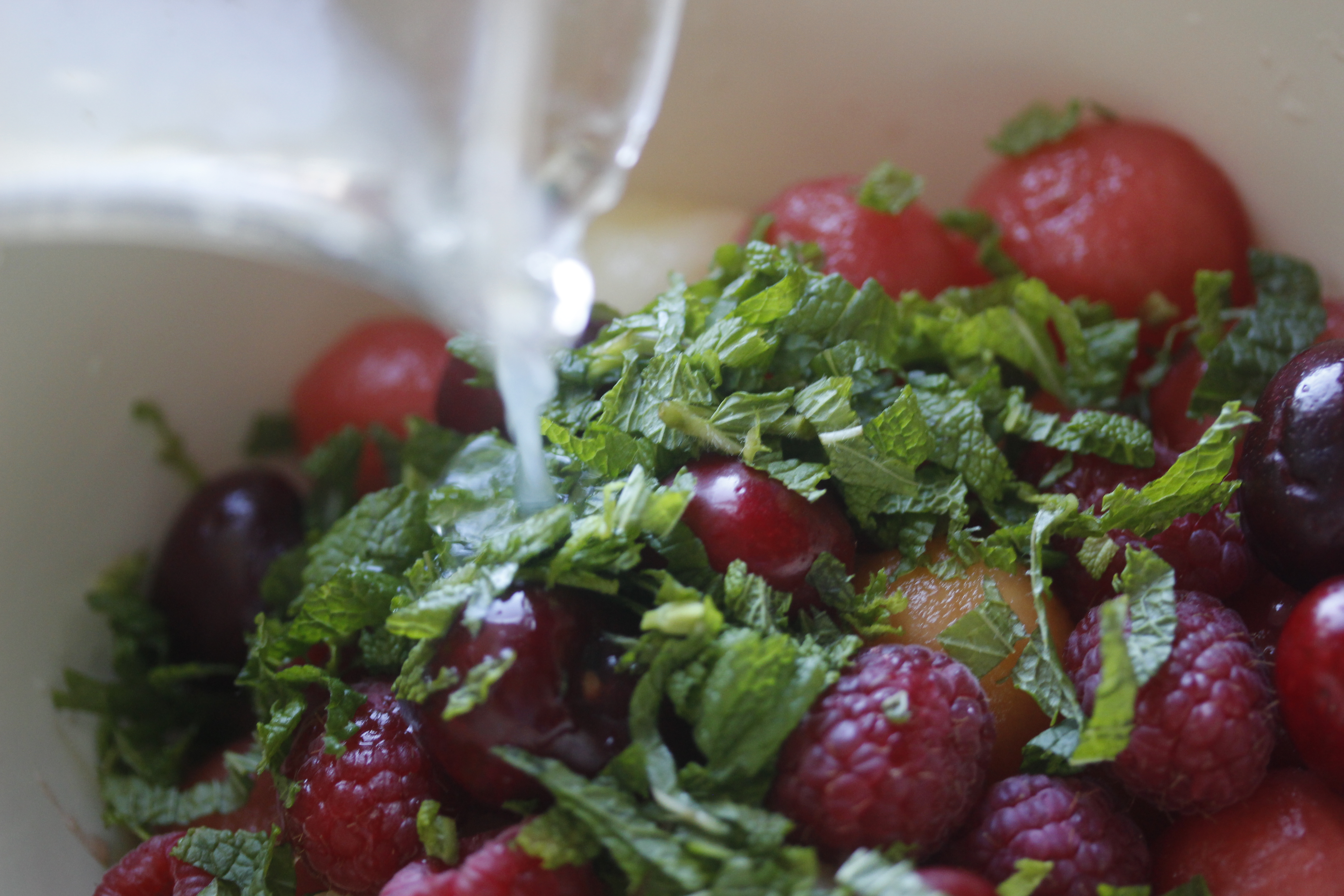 Ég setti alla ávextina í skál ásamt svona 10 mintulaufum, grófsöxuðum. Kreisti svo safann úr hálfri sítrónu, hrærði svona 1 msk af vodka saman við (en honum má alltsvo sleppa), hellti þessu yfir berin, blandaði vel og kældi í a.m.k. 1 klst. Hrærði öðru hverju. Það má líka setja ögn af hunangi út í ef maður vill hafa þetta svolítið sætara. Ég geri það ekki.
