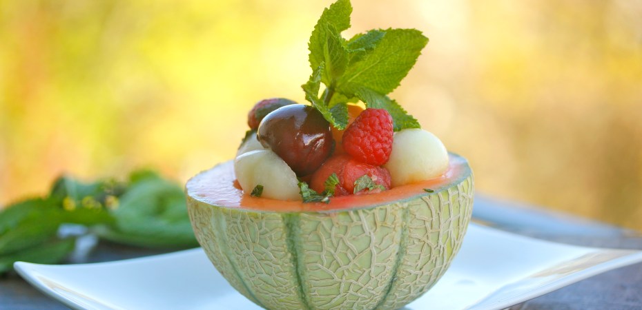Ég fékk eitthvað svipað í Róm í vor, reyndar ekki með vodka (fylgdarsveinninn minn var jú ekki nema þrettán ára og við vorum ekkert í neinu svalli, þótt fyrir kæmi að hann fengi sér ís og ég þá hvítvínsglas eða eitthvað á meðan, og bæði ánægð með sitt. Og við eitthvert slíkt tækifæri fékk ég mér einmitt ávaxtasalat í melónu. Án vodka semsagt, og þótt hann sé hér með má auðvitað alveg sleppa honum. Svo að gjörið svo vel, coppa di melone con frutta.