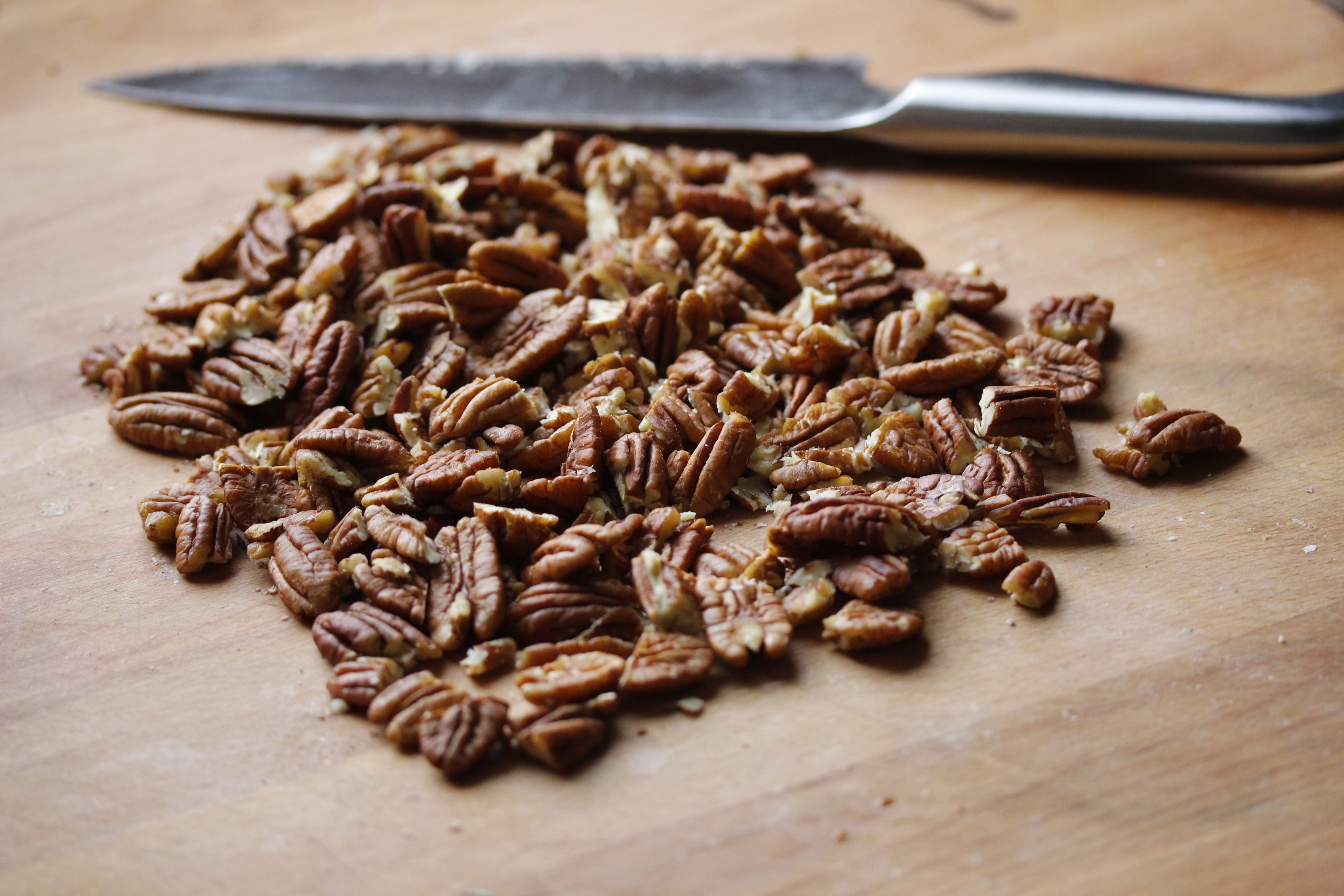 Ég byrjaði á að kveikja á ofninum og stilla hann á175°C. Svo tók ég til 250 g af pekanhnetum, saxaði þær mjög gróft og dreifði þeim á pappírsklædda bökunarplötu. Ég ristaði þær í ofninum í 7-8 mínútur, eða þar til þær eru rétt aðeins byrjaðar að taka lit, en það þarf að gæta þess vel að þær brenni ekki. Svo tók ég þær svo út og lét kólna.