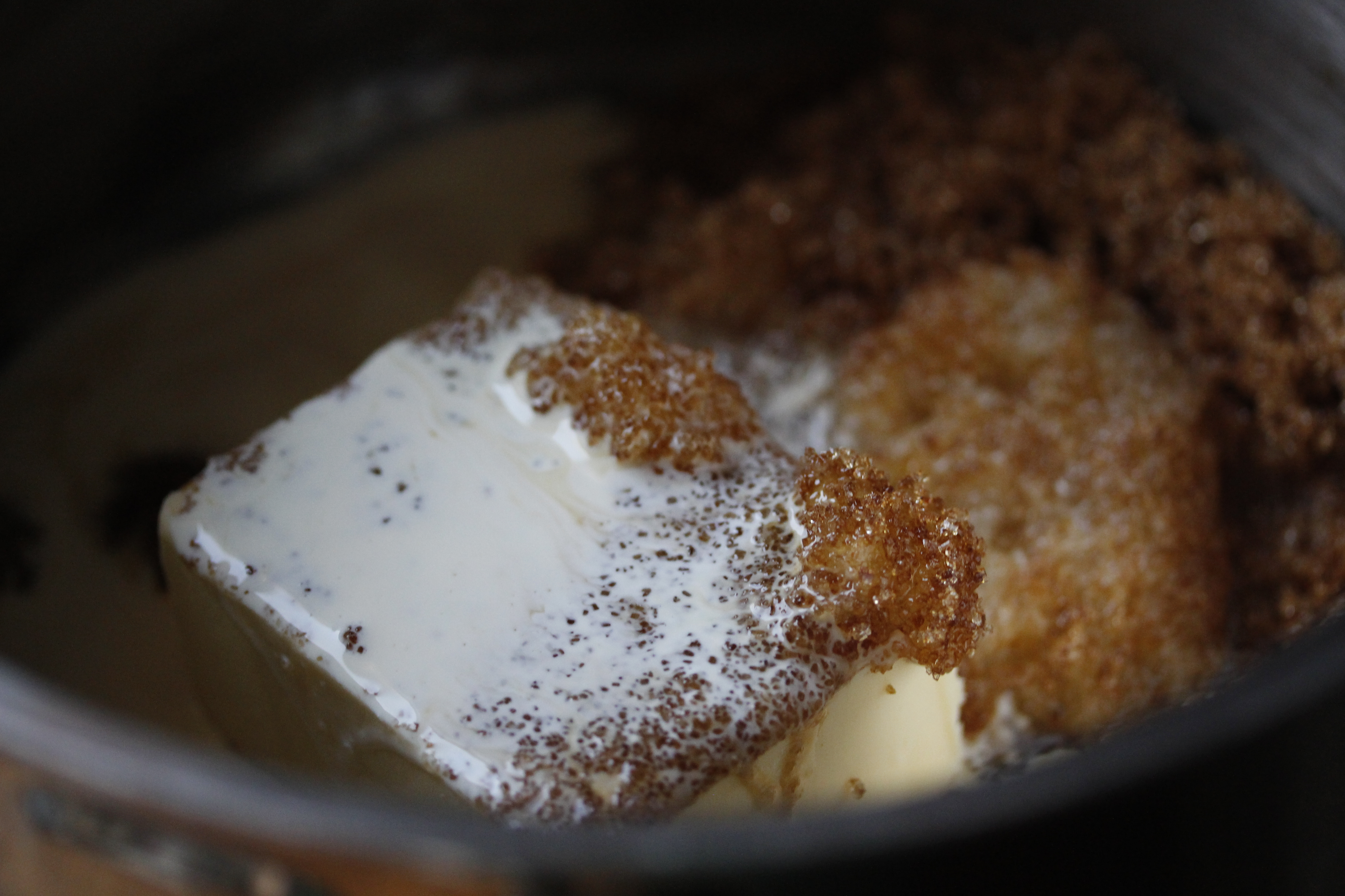 Á meðan setti ég 100 g af púðursykri, 100 ml af hunangi, 125 g af smjöri og 100 ml af rjóma í pott, hitaði að suðu og lét malla …