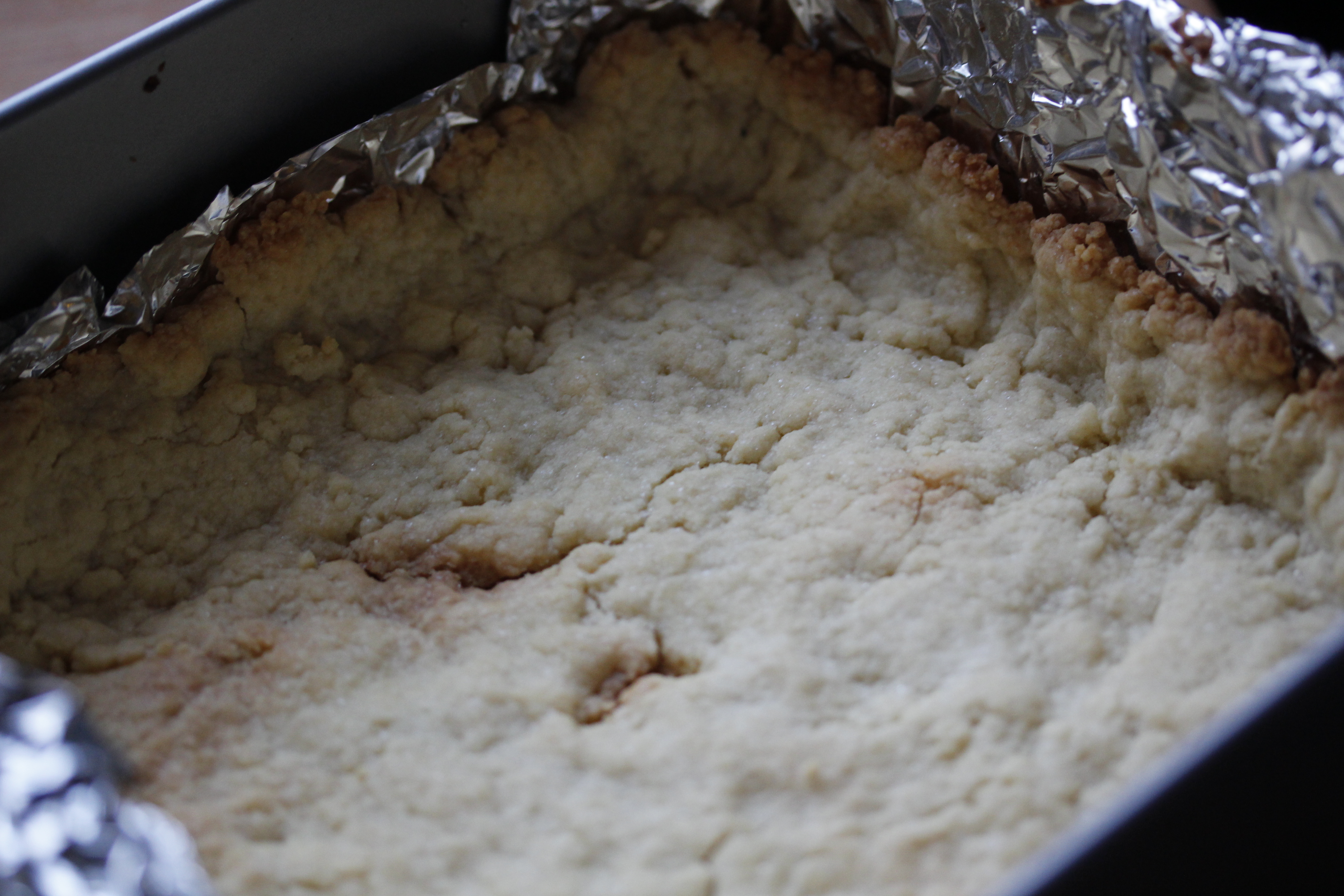 Þá hellti ég deigmylsnunni í formið og þrýsti henni niður á botninn og um 3 cm upp eftir hliðunum.