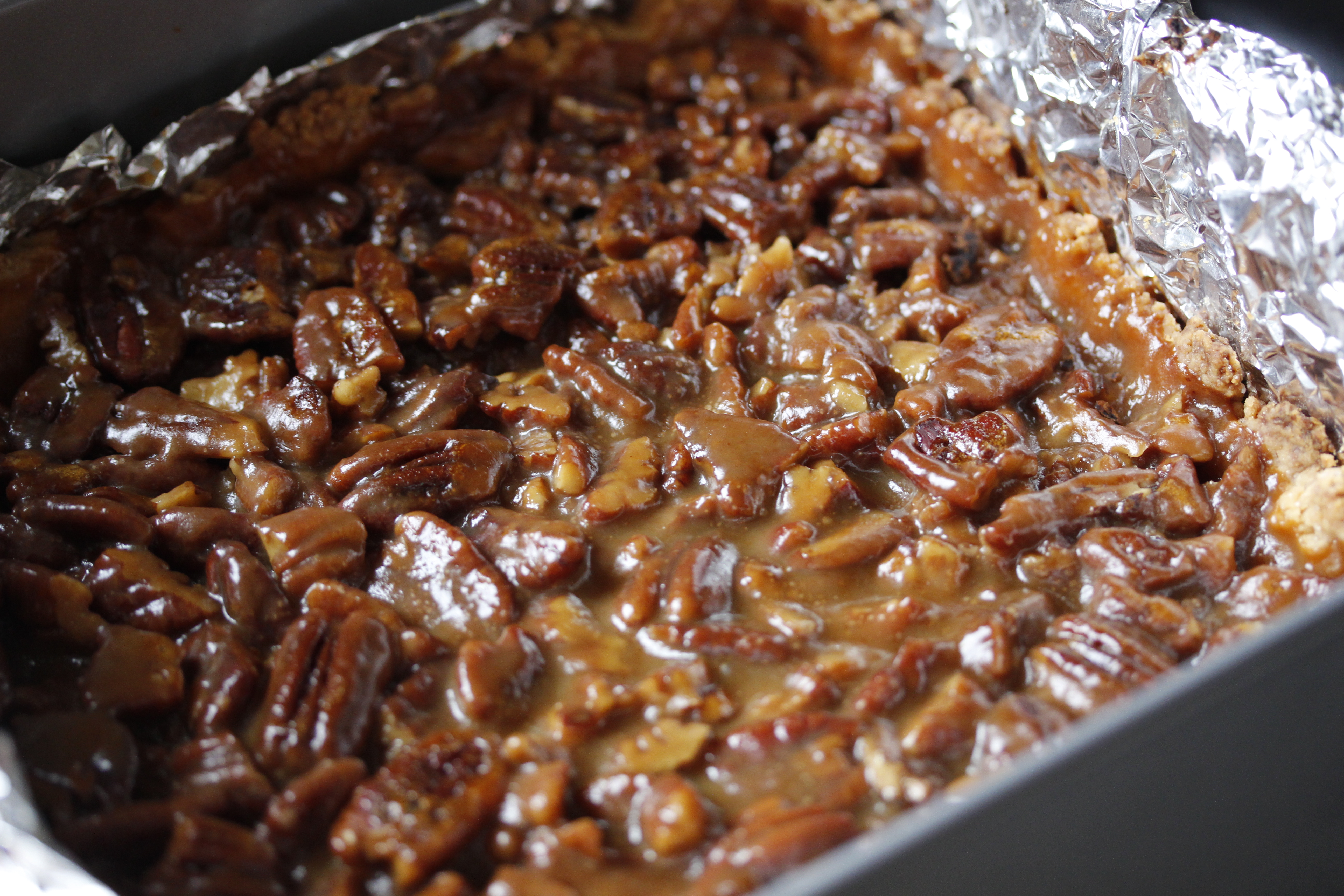 Ég setti svo pekanhneturnar í bökuskelina og dreifði úr þeim. Hellti karamellunni jafnt yfir.