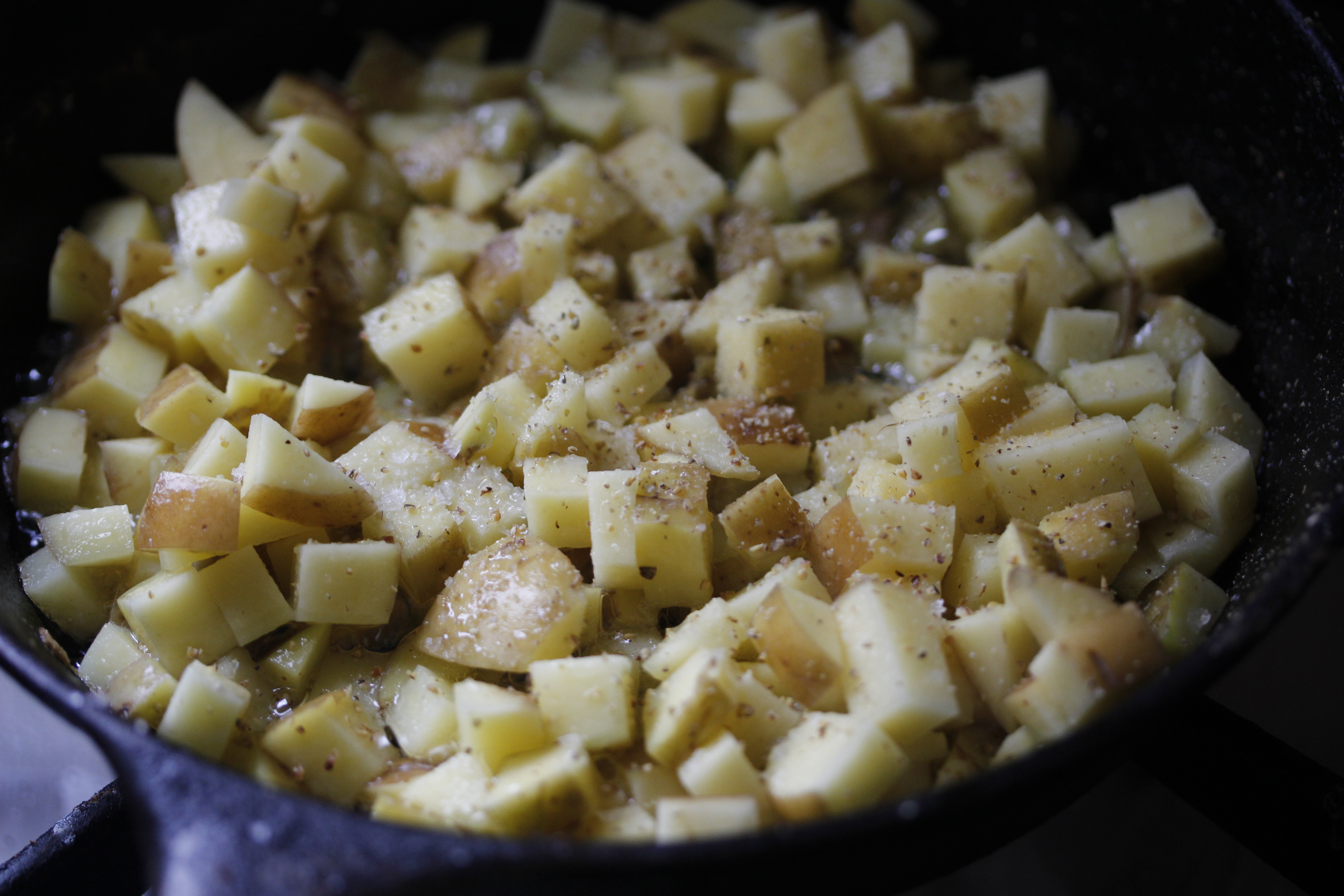 Svo hitaði ég 100 ml af olíu á stórrp pönnu. Setti teningana á hana og dreifði vel úr þeim, kryddaði með pipar og salti og steikti teningana við meðalhita þar til þeir voru meyrir og gullinbrúnir – það gæti tekið 8-10 mínútur. Hrærði oft í þeim á meðan. Tók þá svo upp með gataspaða og setti á eldhúspappír til að láta renna af þeim.