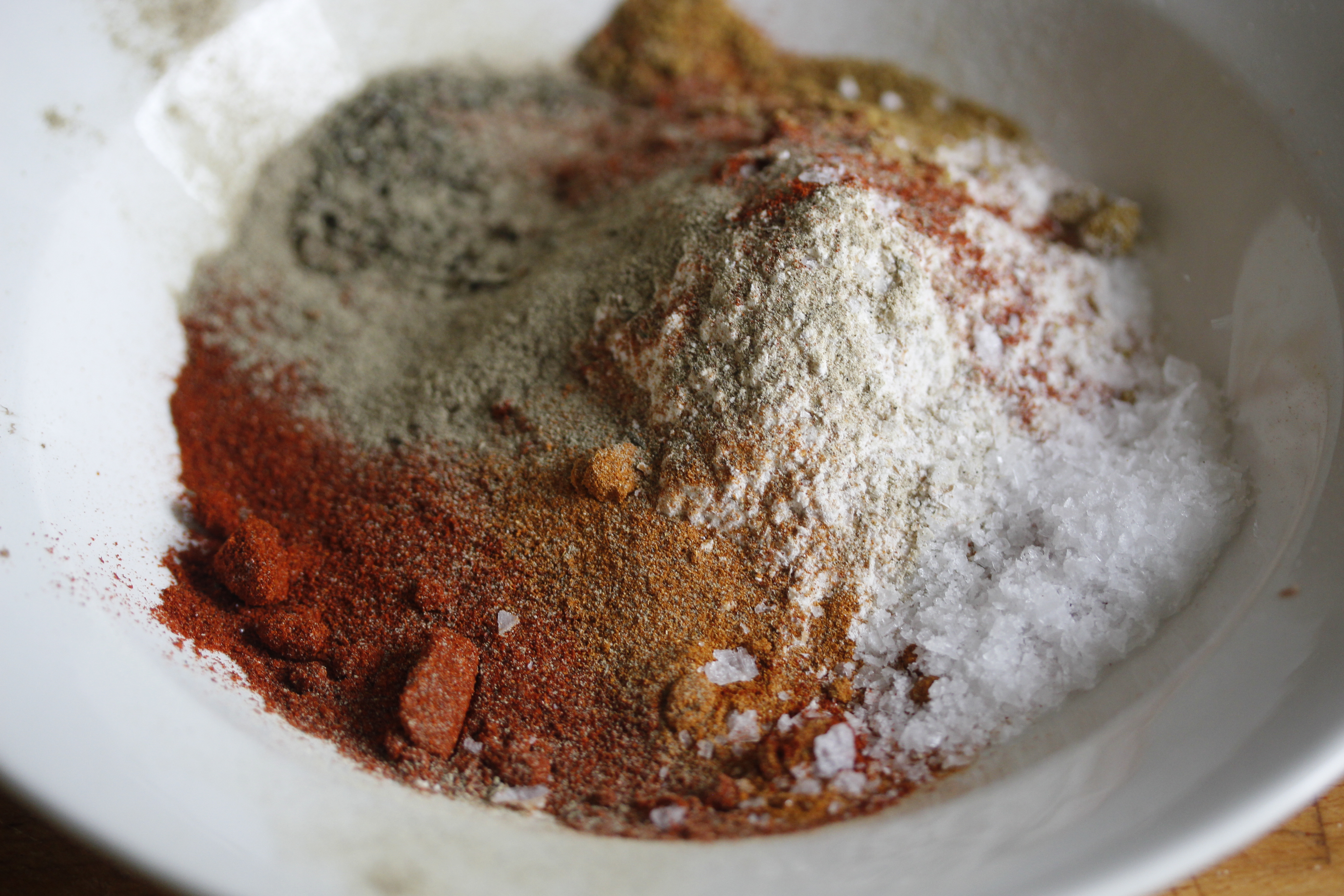 Ég blandaði svo saman 3 msk af hveiti, 2 tsk af paprikudufti, 1 tsk af kummini, 1 tsk af timjani,, 1/2 tsk af childufti (ekki chilipipar) og dálitlum pipar og salti á diski.