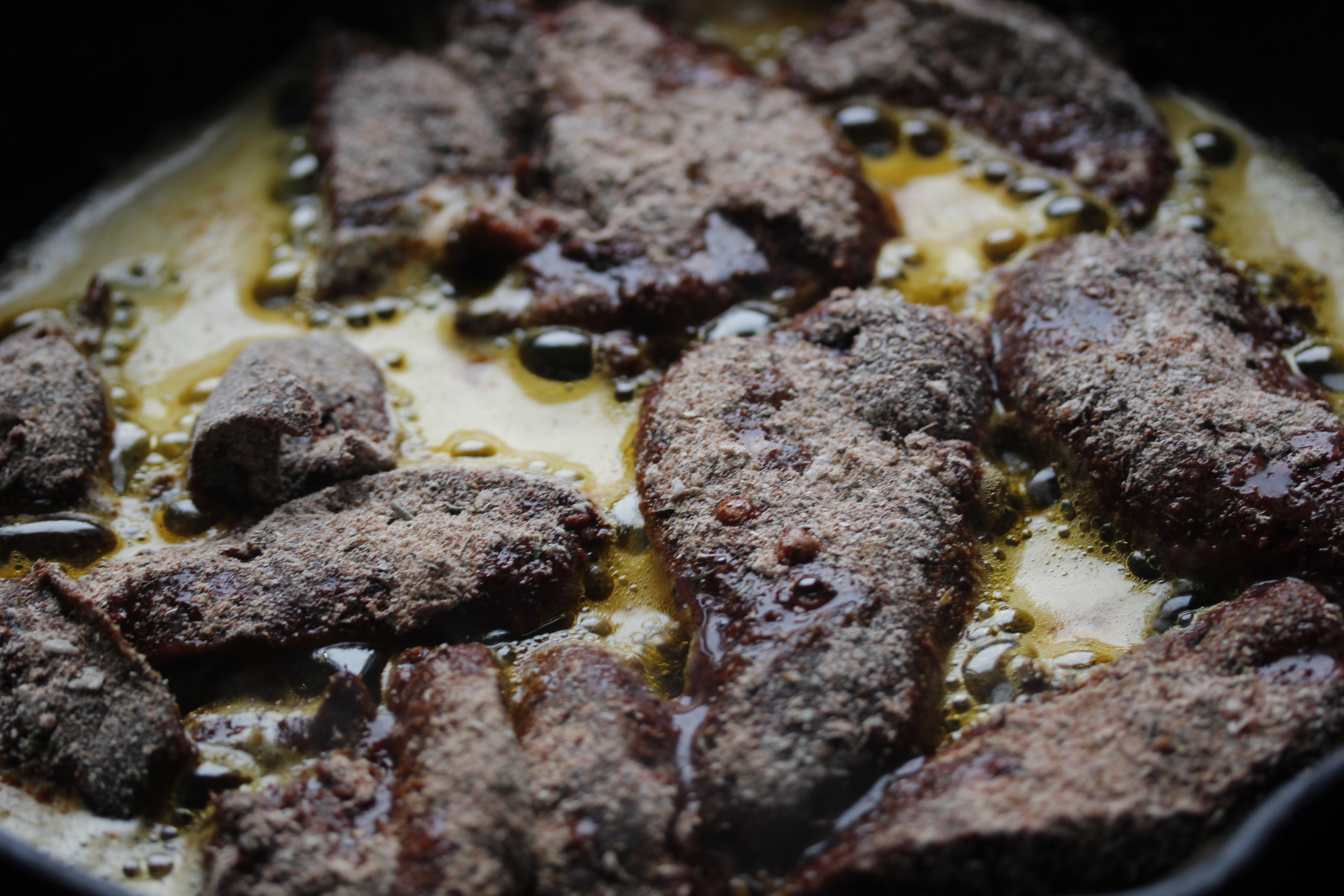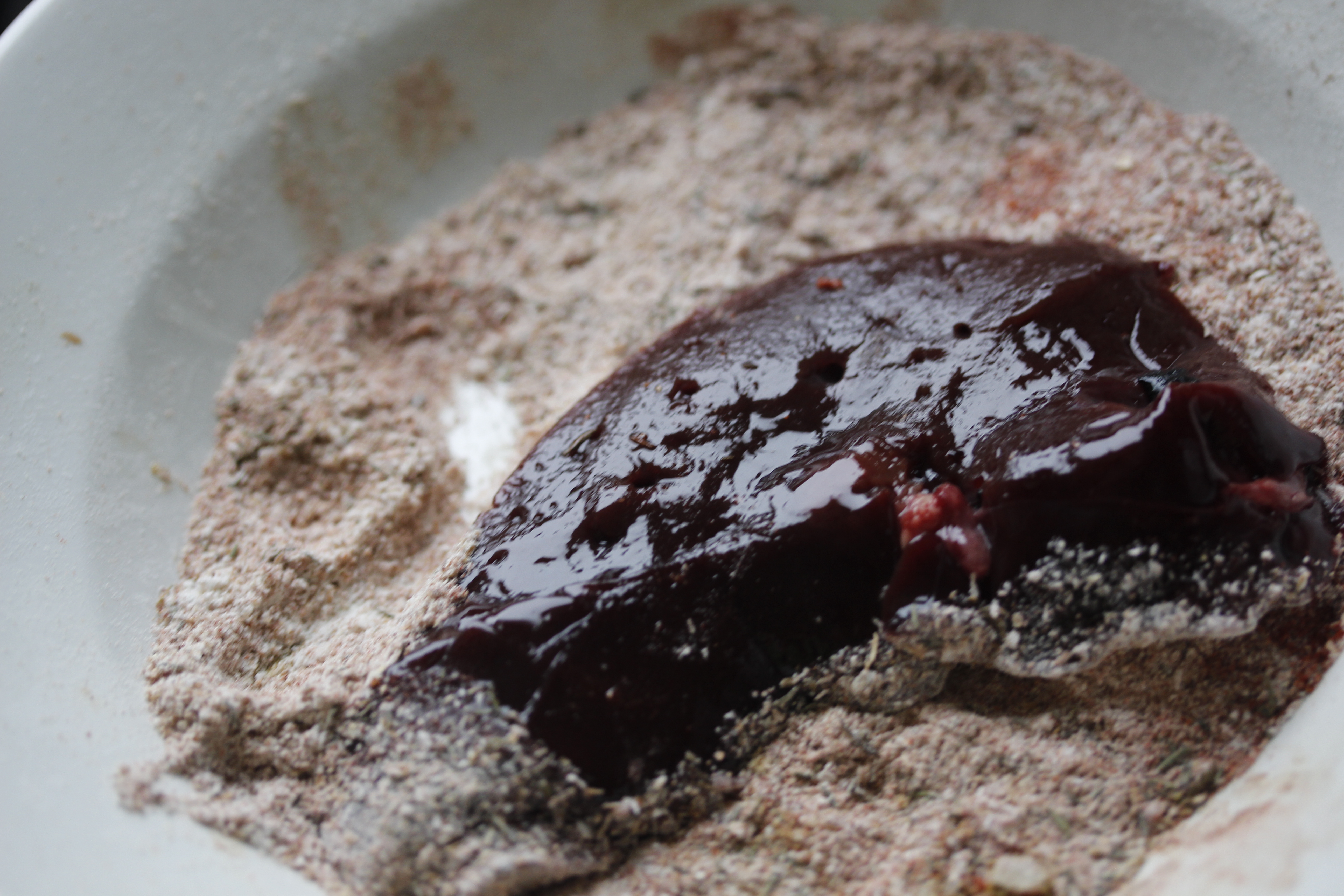 Ég velti lifrarsneiðunum vel upp úr hveitiblöndunni.