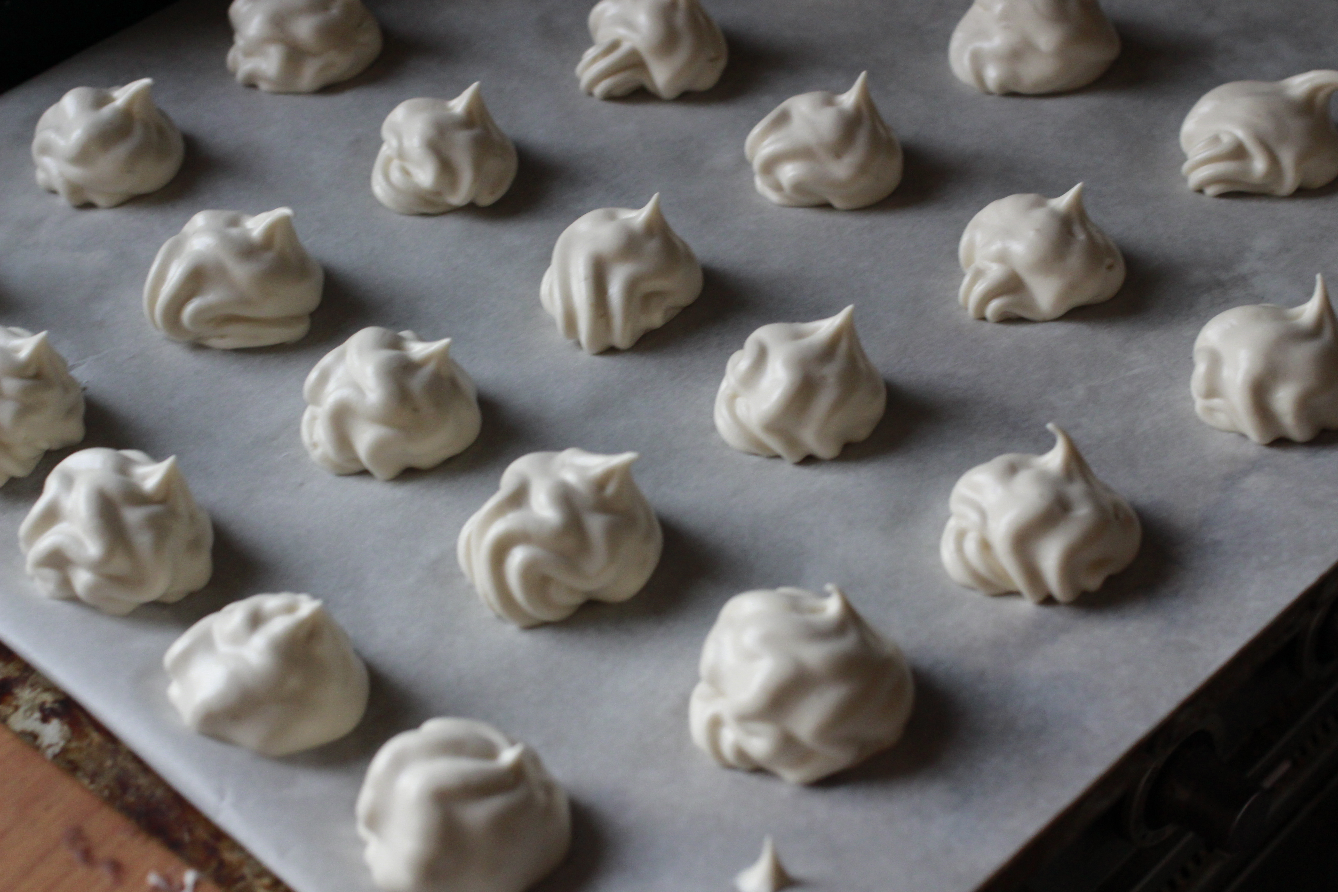 Ég hef aldrei verið sérlega mikið fyrir marens, ekki heldur þegar ég hámaði í mig sykur eins og enginn væri morgundagurinn og ég yrði aldrei miðaldra og þyrfti aldrei að hafa áhyggjur af áunninni sykursýki og svoleiðis. Þannig að ég sakna marensterta og makróna og svoleiðis afskaplega lítið. Ég var samt að baka svoleiðis núna um helgina en það var bara í tilraunaskyni og hafði soninn til að smakka það sem ég bakaði í gær og læt kannski einhvern smakka á morgun það sem ég bakaði áðan – stakk reyndar upp í mig smábita sem brotnaði úr einni kökunni og það var ekkert að honum nema hann var allt allt alltof sætur (þetta gerist þegar maður hættir alveg að borða sykur, sætubragðið verður sterkara).