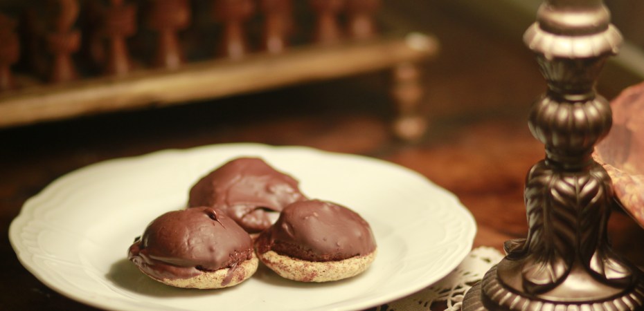 Ég bræddi svo 150 g af Síríus suðusúkkulaði í mínum ágæta súkkulaðipotti (eða bara í skál yfir potti), tók kökurnar úr frysti og dýfði kremhliðinni í súkkulaði. Svo má alltaf bæta við súkkulaði ef þetta er ekki nóg.