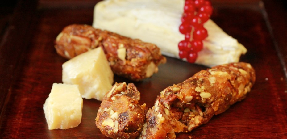 En allavega: Ég gerði þessar rúllur fyrir nóvemberblað MAN. Ég veit ekki hvort ég nota alveg sömu blöndu af ávöxtum núna, man ekki fyrir víst hvað ég á, en það er ekki svo nauið – það má t.d. nota rúsínur og þurrkuð epli ásamt öðrum ávöxtum. Og svo nota ég örugglega Calvados í þær. Þær eru fínar með ostum og kexi eða snittubrauði.
