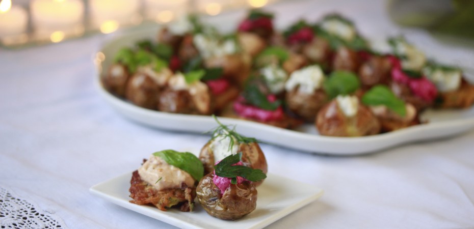 Ég hitaði ofninn í 220°C. Setti kartöflurnar í lítið, eldfast mót, hellti olíunni yfir og kryddaði með pipar og salti. Velti kartöflunum til að þekja þær olíu og bakaði þær síðan í um hálftíma, eða þar til þær voru orðnar vel meyrar og farnar að taka lit. Svo lét ég þær hálfkólna og skar síðan djúpan skurð í miðjuna á hverri kartöflu og setti u.þ.b. 1/2 tsk af fyllingu í hana. Ég skreytti þetta með kryddjurtum en það er út af fyrir sig ekki nauðsynlegt.