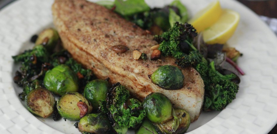 … og svo velti ég stykkinu yfir á roðhliðina og setti um leið rósakálið og grænkálið á pönnuna. Steikti við ríflega meðalhita í 1 1/2 mínútu og hrærði nokkrum sinnum í grænmetinu. Svo sneri ég lúðunni yfir á hina roðhliðina, stráði fræjunum yfir grænmetið og steikti áfram í 1 1/2 mínútu. Þá var lúðan tilbúin og ég tók hana af pönnunni en steikti grænmetið í svona mínútu í viðbót.