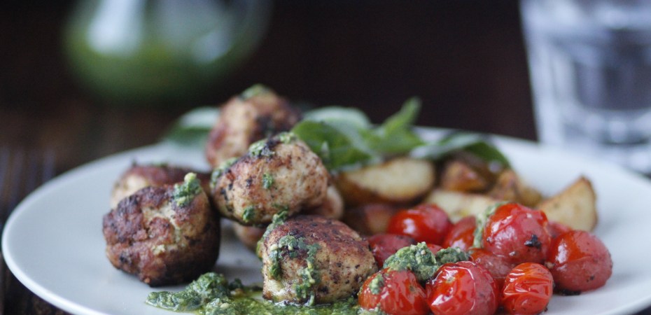 Fiskibollur með kartöflubátum, tómötum og basilíkusósu