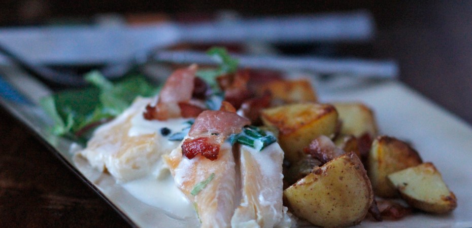 Reykt ýsa með beikoni, kartöflum og vorlaukssósu