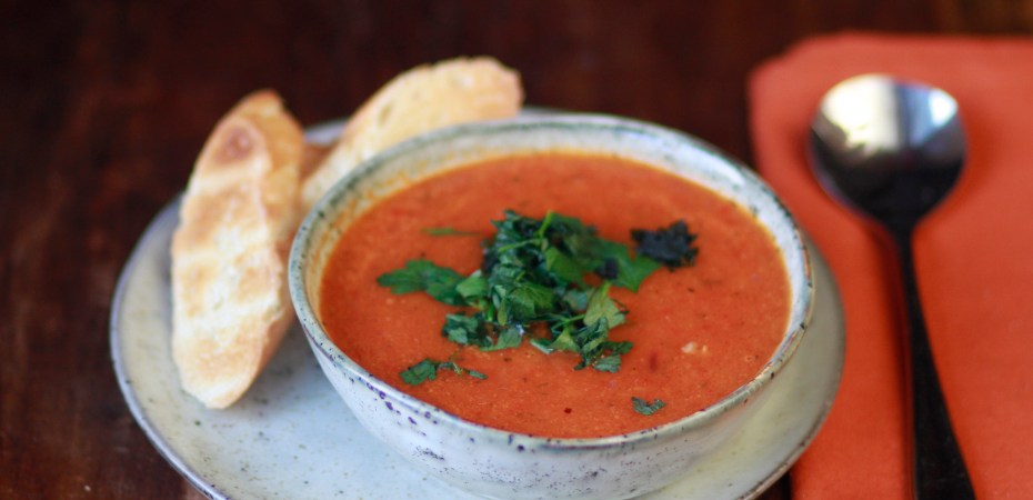 En semsagt, uppskriftin núna er ekki með lakkrís og reyndar heldur ekki nautakinnum og nautabringu, þótt það væri nú alveg ljómandi gott. Hún tekur hins vegar mið af veðrinu og eins og það er núna myndi ég ekkert vera að skera chili-ið sérstaklega við nögl. Þetta er semsagt paprikusúpa (eða strangt til tekið papriku- og tómatsúpa). Uppskriftin var gerð fyrir janúarblað MAN og líklega má segja að það sé dálítill janúar í henni.