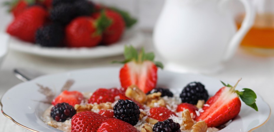 Ég var með slatta af ljómandi fallegum berjum til að nota í ýmis verkefni en tók nokkur þeirra frá út í grautinn minn. Af því að það var nú frídagur (þetta var um páskana).