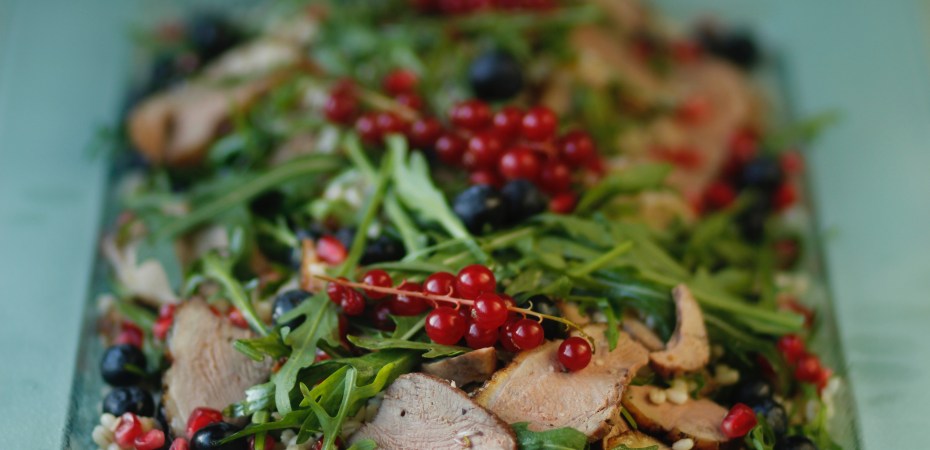Dreifði salatinu á fat og skreytti með meir bláberjum og líka rifsberjum, af því að ég átti þau (en það mætti líka nota jarðarber, eða láta bláberin duga).