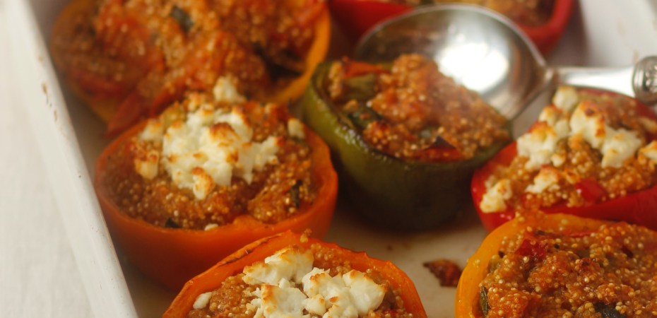 Kínóakornið – sem reyndar er fræ en ekki korn – þykir sérlega næringarríkt. En það mætti líka nota t.d. hrísgrjón í þennan rétt. Ef verið er að elda eitthvað annað úr paprikum er upplagt að taka botnana af þeim frá og nota til að fylla en það má líka nota hálfar paprikur, skornar langsum.