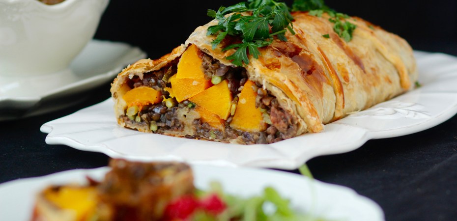 Á allra síðustu árum er töluvert um að fólk (ekki síst ungt fólk) gerist grænmetisætur og oft grænkerar (vegan) og þá standa margir alveg á gati þegar kemur að hátíðamatnum. Ég var með uppskriftir að kjötlausum hátíðamat í nóvemberblaði MAN og hér kemur ein þeirra og ekki sú sísta, „Wellingtonsteik“ (eða þannig) fyrir grænmetisætur eða grænkera – það fer eftir deiginu sem notað er. Annars er líka slatti af veganuppskriftum hér og sumar þeirra gætu hentað ágætlega um jól og áramót.