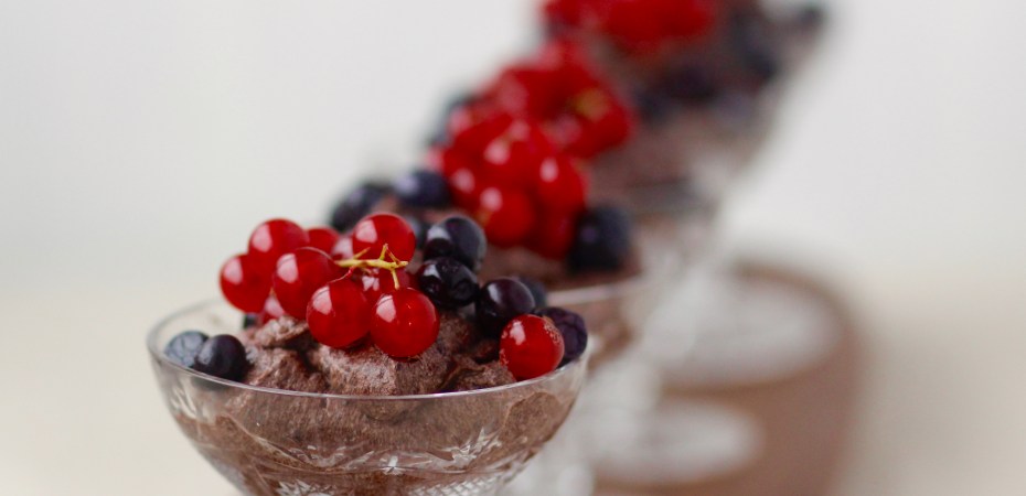 Setti þetta í sex ábætisglös eða -skálar (auðvitað má líka setja allt í eina stærri skál), skreytti með berjum (ég átti bláber og rifsber en það má líka nota önnur, eða sleppa berjum og strá t.d. kakódufti yfir) og kældi nokkra stund.