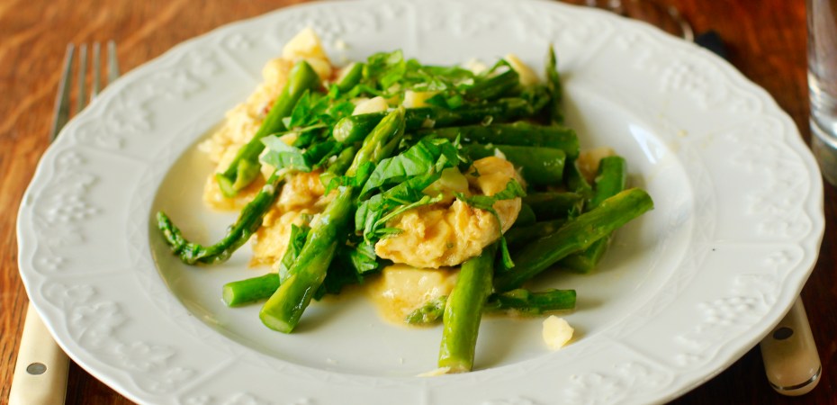 Ég var búin að skera smábita af sterkum enskum cheddarosti (eða hvaða osti sem er, ef það er bragð að honum) í teninga – þetta voru kannski 2-3 msk – og stráði yfir eggjahræruna og setti svo spergilinn yfir allt saman.
