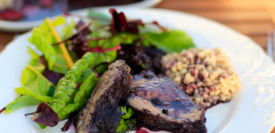 Ég var búin að sjóða bygg (perlubygg frá Vallanesi, en það má líka nota venjulegt bygg, nú eða hafa bara hrísgrjón eða kartöflur eða eitthvað allt annað) og setti það á fat. Setti kjötið með og jós berjum og sósu yfir.