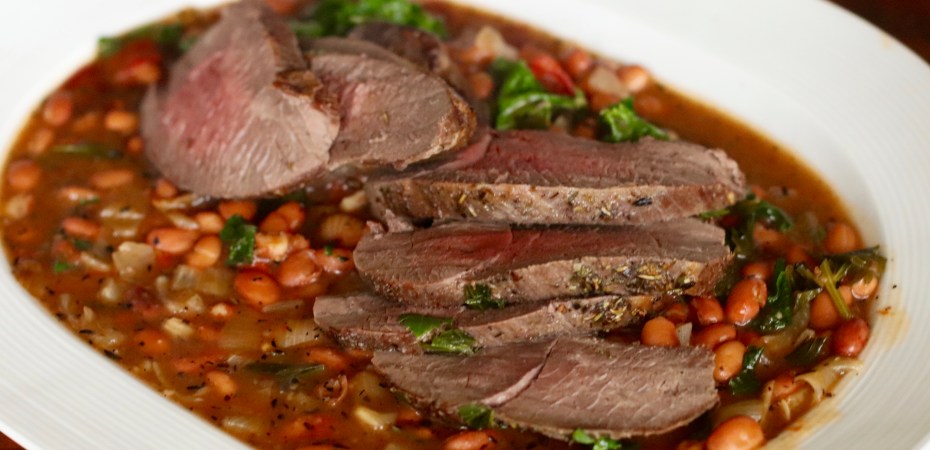 Svo setti ég baunakássuna á fat, skar kjötið í sneiðar og setti ofan á. Með þessu er gott að hafa kartöflustöppu eða bara grænt salat, en þar sem ég bar þetta fram með öðrum rétti sem var með tagiatelle, þá var meðlætið (auk baunanna) bara pasta. Það var ágætt líka.