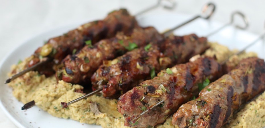 Ég dreifði svo maukinu á fat, raðaði pinnunum ofan á og stráði ögn af saxaðri steinselju og súmaki yfir en það má alveg sleppa því. Svo má auðvitað hafa kjúklingabaunamaukið í skál og bera kebabið fram t.d. á salatblöðum.