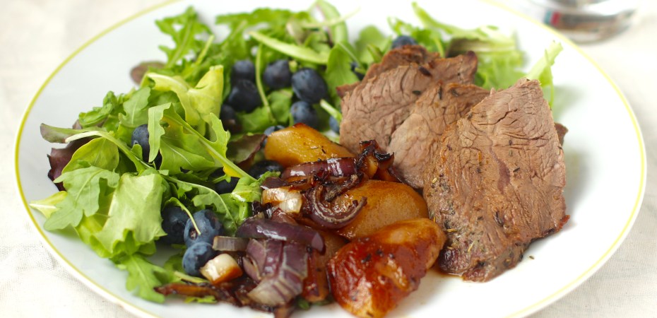 Ég lét kjötið bíða í nokkrar mínútur og skar það svo í fremur þunnar sneiðar, þvert á vöðvaþræðina, og setti á disk ásamt perum, lauk og salati (klettasalat með bláberjum). Svo jós ég safanum úr fatinu yfir.