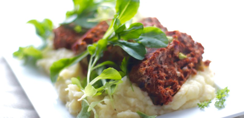 Ég var búin að búa til kartöflustöppu sem ég dreifði á fat. Svo tók ég kjöthleifinn og setti á bretti, skar hann gætilega í nokkrar þykkar sneiðar og lagði þær ofan á stöppuna og dreifði svo salatblöðum yfir. En auðvitað má líka bera kjöthleifinn fram heilan og hafa stöppuna og salatið bara til hliðar. Eða hafa bara soðnar kartöflur og grænmeti, eða eitthvert allt annað meðlæti, til dæmis kúskús, soðið bygg eða hrísgrjón. (Athugið að myndirnar sýna ekki alveg réttan lit á kjötinu, það var ekki eins rauðbrúnt og það virðist.)