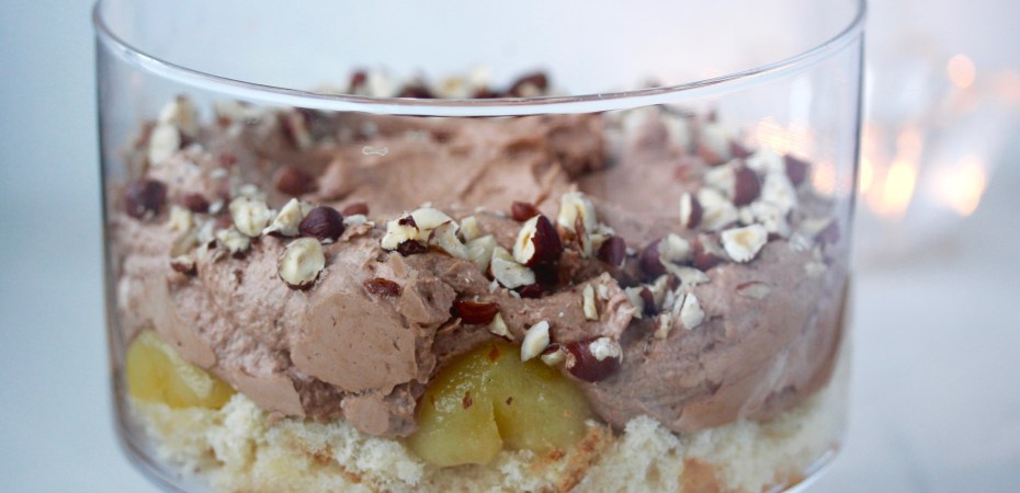 Síðan tók ég svamptertubotn (ég var með heimabakaðan en það má líka kaupa hann í búð), reif hann niður og setti í glerskál. Flottast er að nota alvöru trifliskál, glerskál á fæti með (nokkurn veginn) sléttum hliðum, eins og þá sem er á myndinni, en hvaða falleg skál sem er gengur. Jájá, auðvitað á ég trifliskál. Fleiri en eina og fleiri en tvær. Svo mældi ég 200 ml af perusírópinu (soðinu) í könnu og hellti jafnt yfir. Það er ekki víst að nota þurfi allt sírópið, bara eins og þarf til að bleyta í kökubitunum – kannski duga 150 ml.
