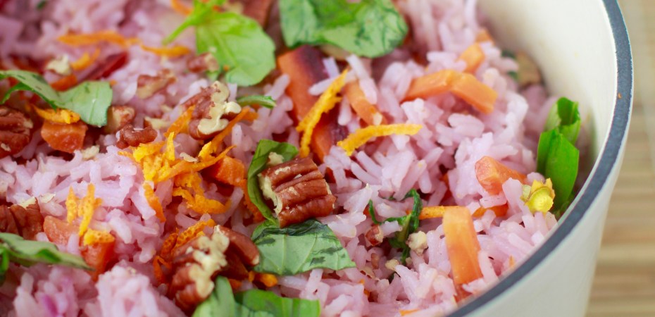 Mér finnst bleiki liturinn setja skemmtilegan svip á pílaffið og gera það býsna óvenjulegt svo að ef þið eigið fjólubláa gulrót mæli ég með að nota hana. Bragðið er þó það sama, hvort sem hrísgrjónin eru bleik eða hvít.
