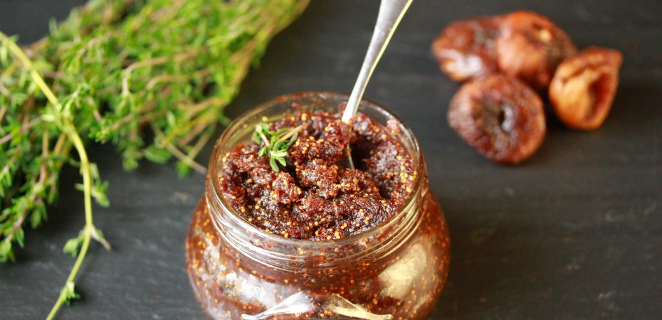 Hér er uppskrift að sultu eða mauki sem er gott eitt sér á brauð eða kex, svo og með ostum, en hentar líka vel með ýmsu kjöti og á vel heima á jólaborðinu. Líklega er annars réttara að kalla þetta mauk en sultu því hér er enginn viðbættur sykur og á móti sætunni úr gráfíkjunum og appelsínusafanum kemur dálítið balsamedik. Gráfíkjur, appelsína, timjan, balsamedik, kanell og salt, það er hráefnið í maukið. Enginn sykur semsagt (nema sá sem er í ávöxtunum, náttúrlega).