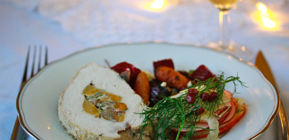 Uppskriftin kemur mögulega seinna en hér er önnur kalkúnauppskrift og kannski heldur jólalegri, því að þetta er kalkúnabringa. Ég gerði þessa uppskrift upphaflega fyrir Kvennablaðið fyrir einhverjum árum.