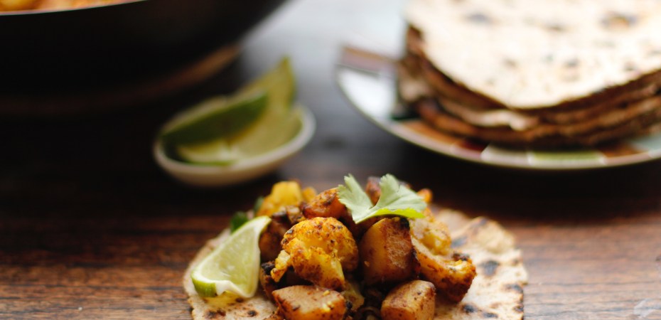 Einn þekkasti indverski grænmetisrétturinn er aloo gobi, upprunninn í Punjab en nú vinsæll um allan Indlandsskagann og til í úteljandi útgáfum sem kannski eiga fátt annað sameiginlegt en að innihalda kartöflur (aloo) og blómkál (gobi). Sumar útgáfurnar eru syndandi í sósu eða að minnsta kosti nokkuð „blautar“ og innihalda þá oft tómata en hér er „þurrt“ aloo gobi, þar sem vökvinn er fyrst og fremst gufa frá grænmetinu sjálfu.