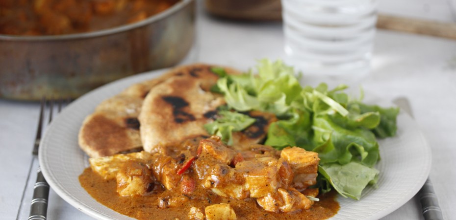 Svo bar ég fiskinn fram með hrísgrjónum eða naanbrauði og e.t.v. grænu salati.