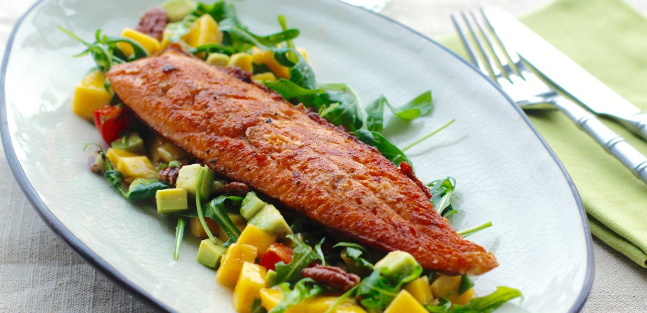 Ég var með fiskibollur í kvöldmatinn. Þær voru ágætar og ég ætlaði eiginlega að setja uppskriftina hér inn – það eru alltaf not fyrir fiskibolluuppskriftir – en svo horfði ég út um gluggann, það gekk einmitt yfir dimmt hríðarél, og mér fannst að það yrði að vera eitthvað litríkara. Og þá mundi ég eftir þessari uppskrift, eldaði þetta í fyrra en var ekki búin að birta, og fannst hún eiga vel við. Steikt bleikja á mangósalsa, akkúrat það sem þarf til að gera lífið ögn bjartara og litríkara. Uppskriftin er fyrir einn en mjög auðvelt að stækka hana. Voruð þið annars búin að sjá að ég bætti inn nýjum flokki (felliglugginn hér hægra megin) með uppskriftum fyrir einn?