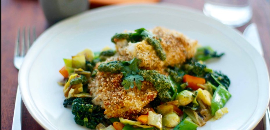Og af því að ég vann nú í karfa hjá Kaupfélagi Skagfirðinga (þ.e. Fiskiðjunni) þarna fyrir 45 árum eða hvað það nú var, þá tók ég KS-diskinn minn. (Eða hvaða djúpa disk sem er.) Setti á hann 100 ml (1 dl) af brauðraspi – ég notaði panko-rasp og finnst það best í svona en það er ekki nauðsynlegt – og blandaði saman við það hálfri teskeið af paprikudufti, sama af þurrkaðri basilíku, pipar og salti. Braut svo eitt egg á annan disk (já, ég á nokkra kaupfélagdiska), skar karfa flökin í nokkra bita og velti þeim upp úr egginu …