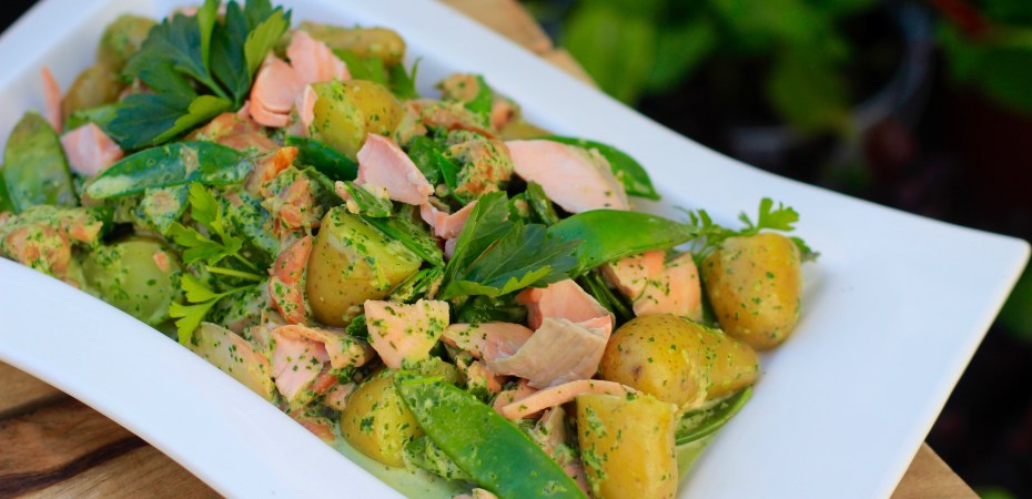 Ég kallaði þetta reyndar kartöflusalat með tvenns konar laxi þegar ég birti uppskriftina í MAN í fyrrasumar en það má alveg eins kalla það laxasalat með kartöflum. Ég hugsaði það sem volgt salat en daginn eftir myndatökuna kom hópur af konum sem ég vinn með í hádegisheimsókn og ég bauð þeim meðal annars upp á salatið; það reyndist vera alveg eins gott kalt.